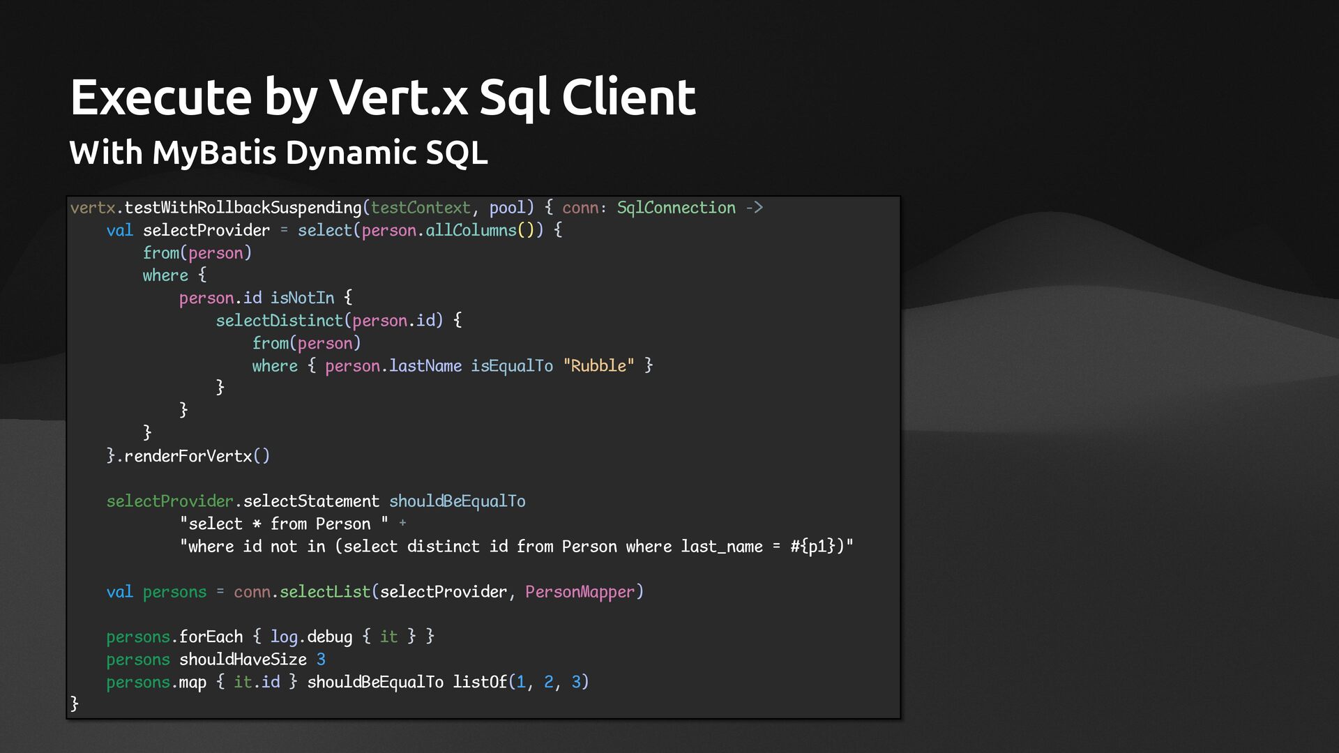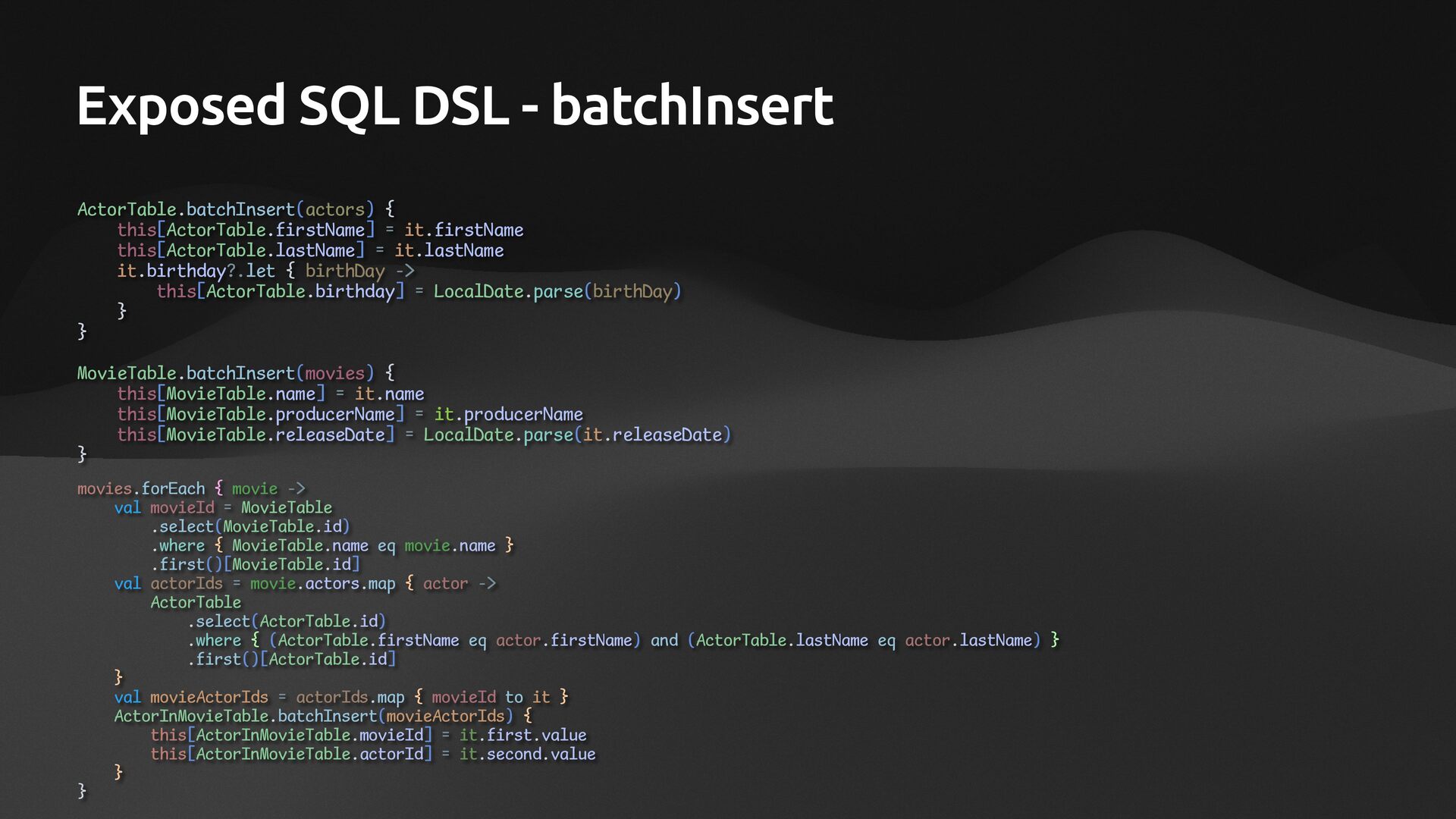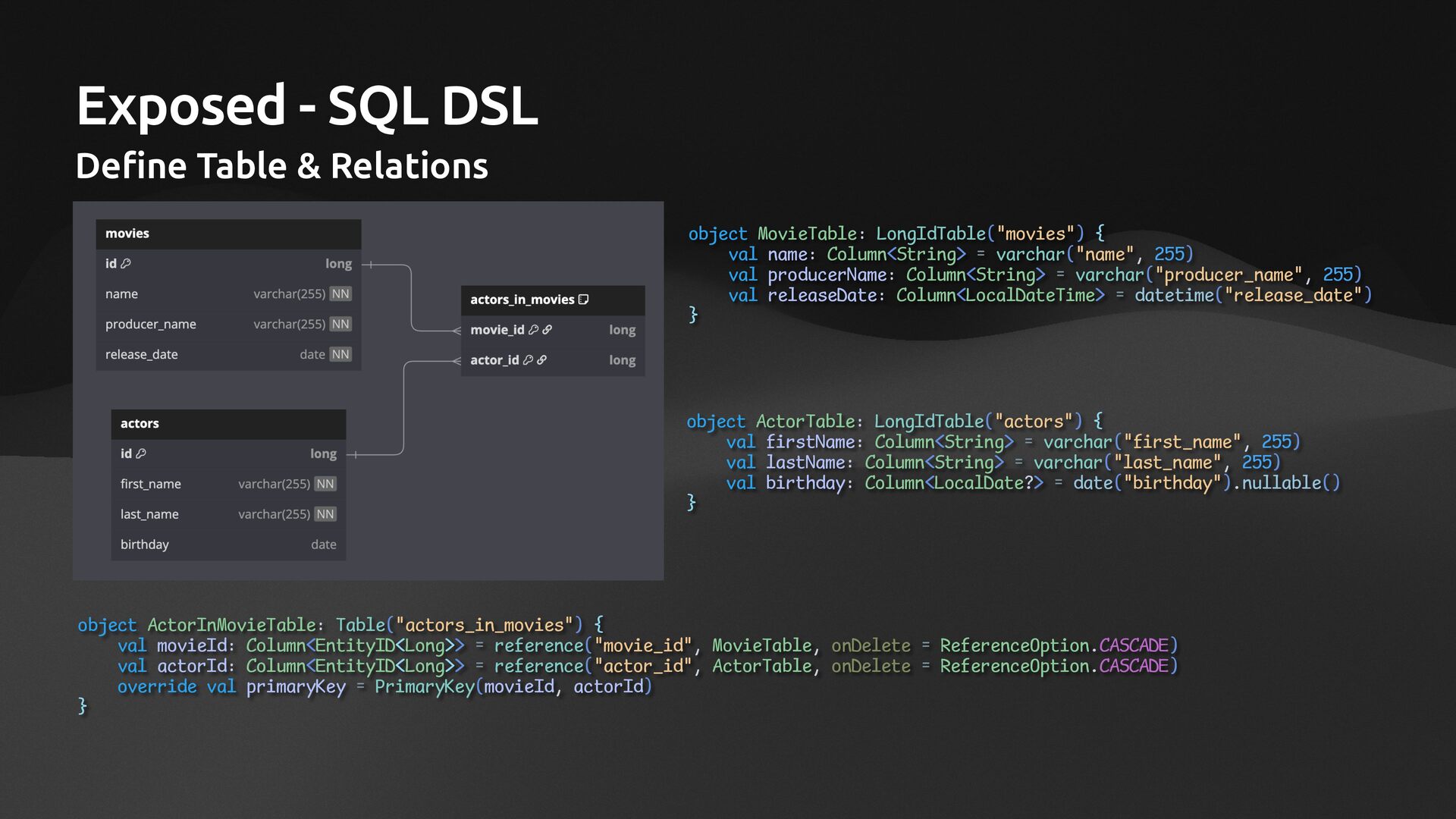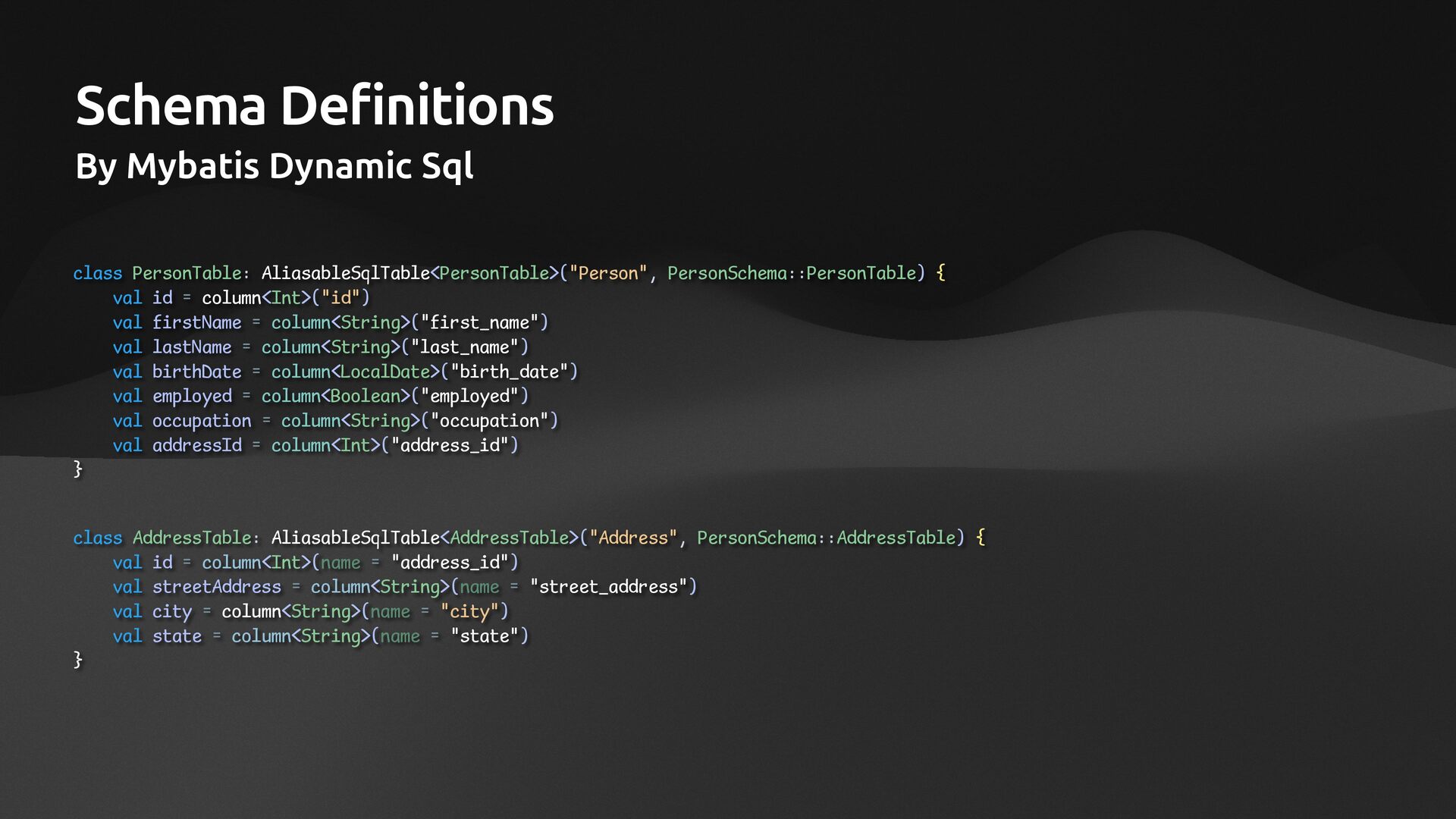 AliasableSqlTable<PersonTable>("Person", PersonSchema::PersonTable) { val id = column<Int>("id") val firstName = column<String>("first_name") val lastName = column<String>("last_name") val birthDate = column<LocalDate>("birth_date") val employed = column<Boolean>("employed") val occupation = column<String>("occupation") val addressId = column<Int>("address_id") } class AddressTable: AliasableSqlTable<AddressTable>("Address", PersonSchema::AddressTable) { val id = column<Int>(name = "address_id") val streetAddress = column<String>(name = "street_address") val city = column<String>(name = "city") val state = column<String>(name = "state") }