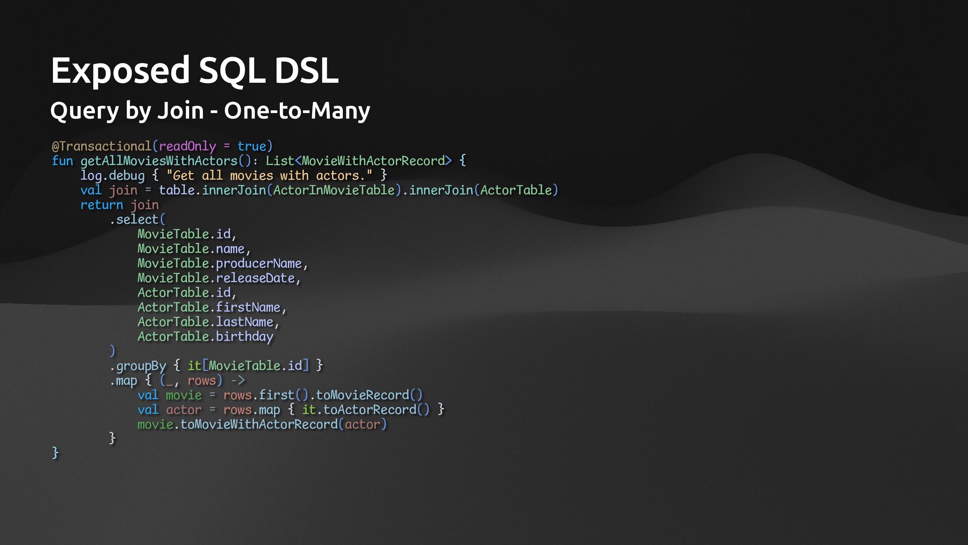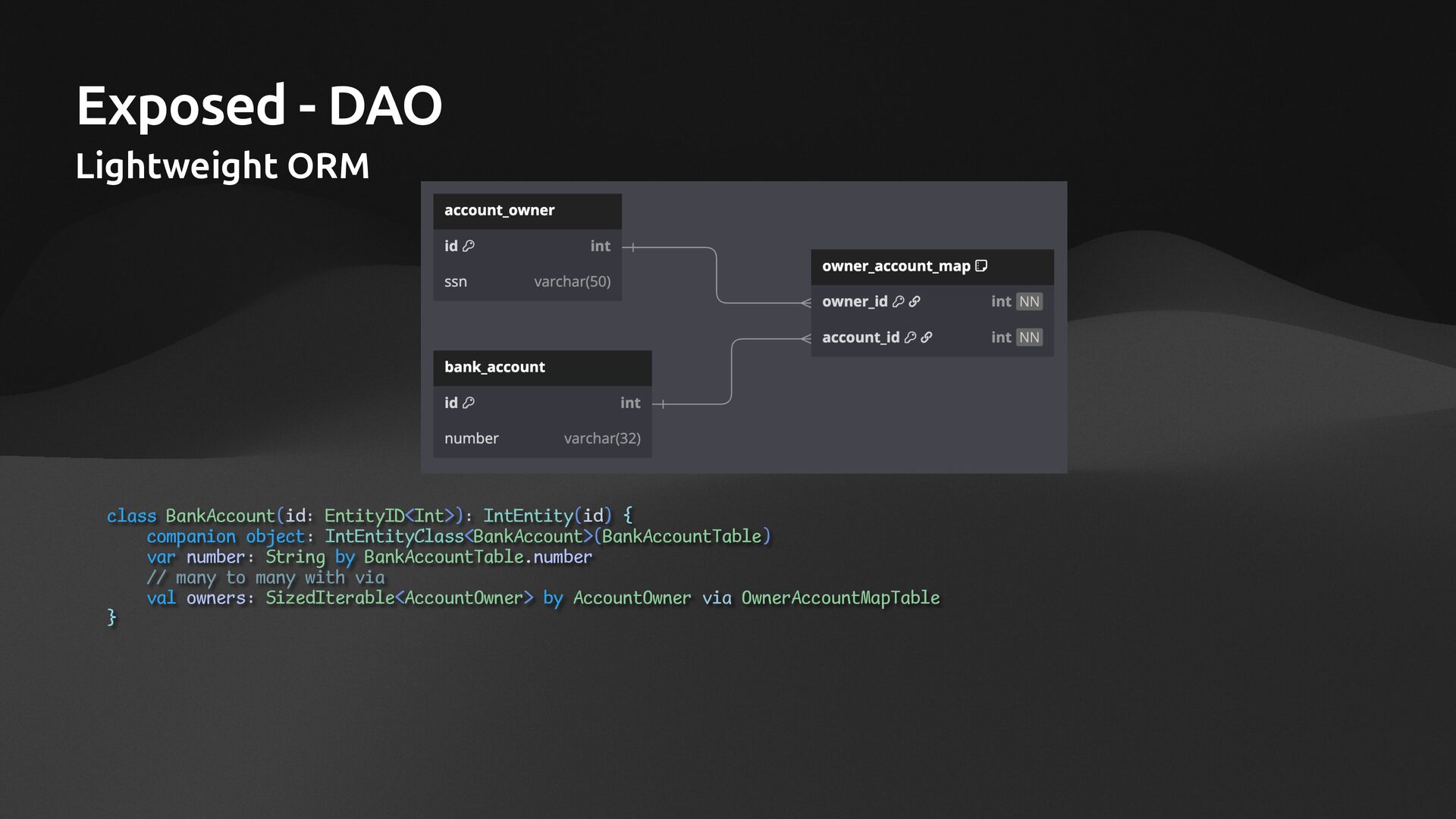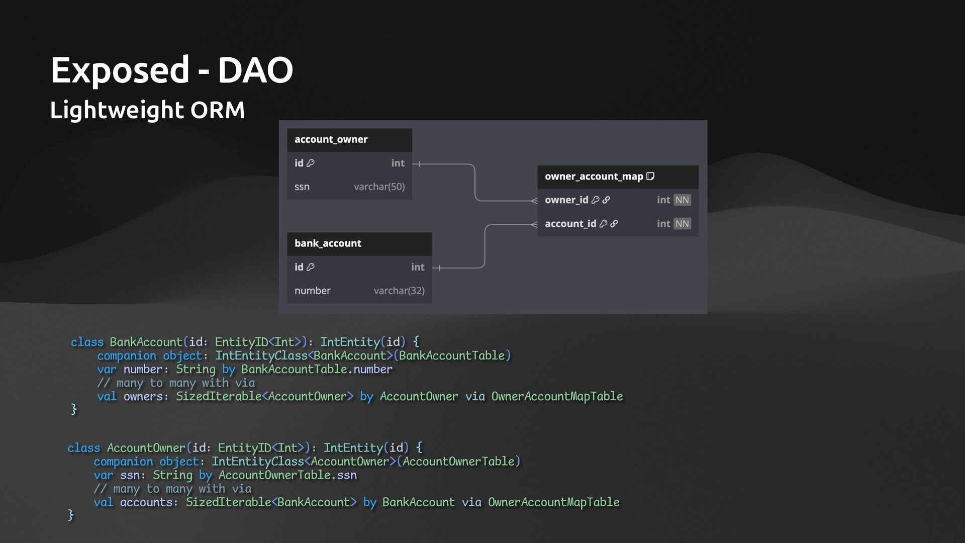 companion object: IntEntityClass<BankAccount>(BankAccountTable) var number: String by BankAccountTable.number // many to many with via val owners: SizedIterable<AccountOwner> by AccountOwner via OwnerAccountMapTable }