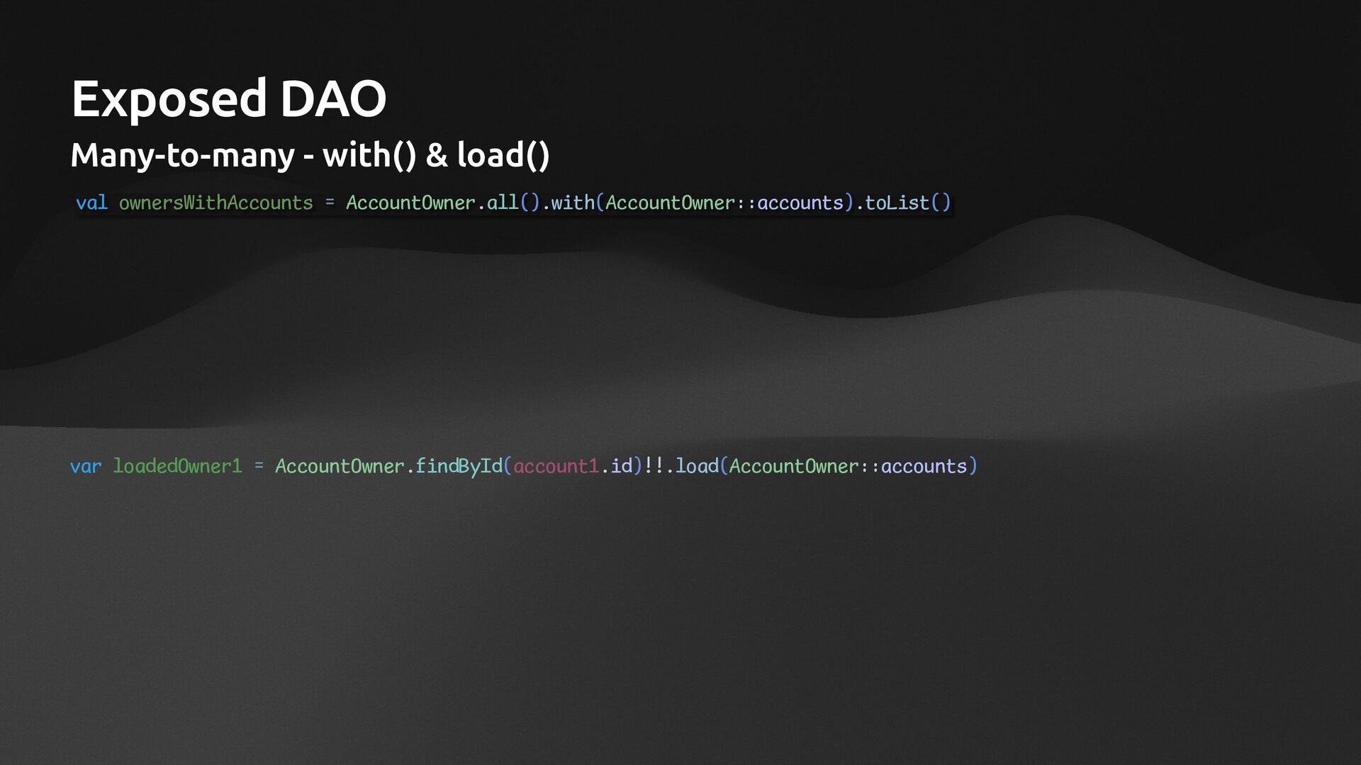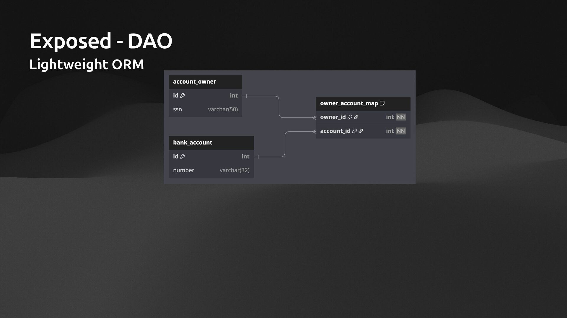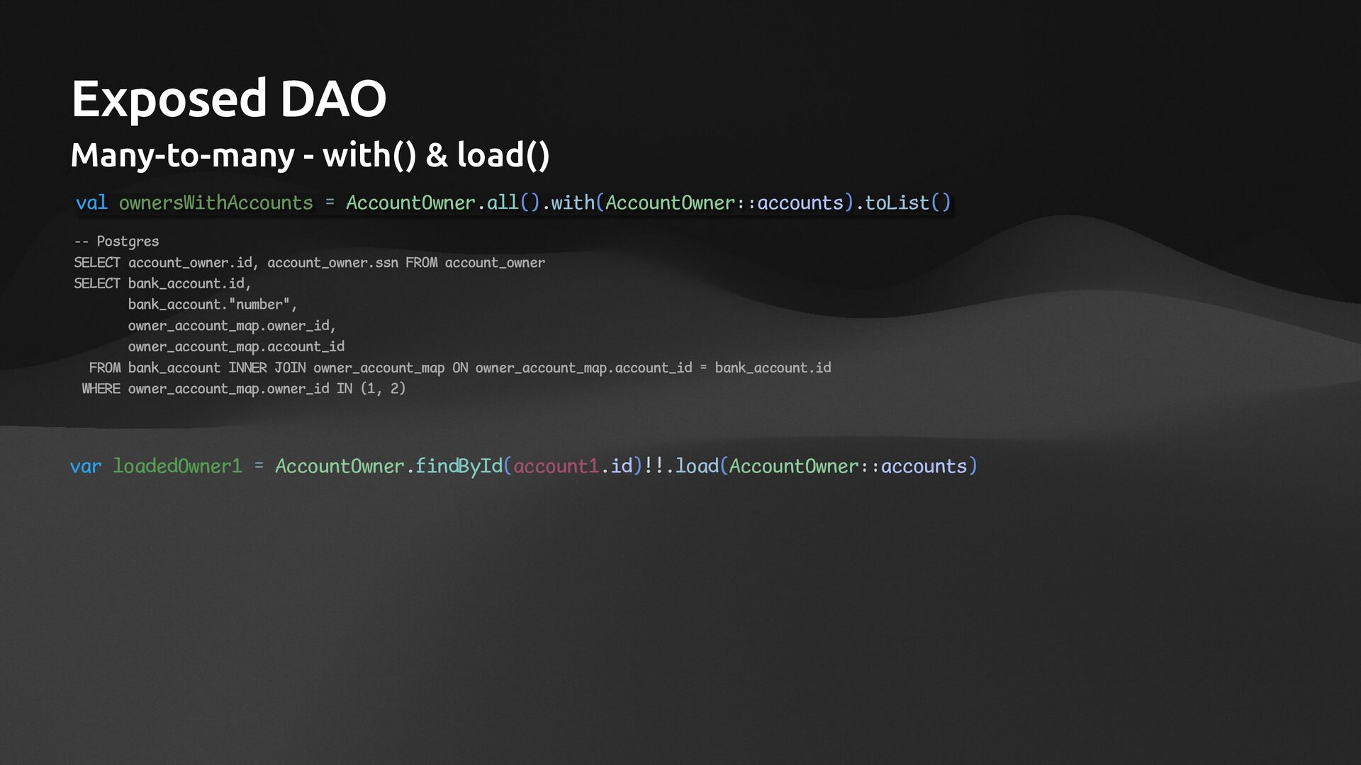 companion object: IntEntityClass<BankAccount>(BankAccountTable) var number: String by BankAccountTable.number // many to many with via val owners: SizedIterable<AccountOwner> by AccountOwner via OwnerAccountMapTable } class AccountOwner(id: EntityID<Int>): IntEntity(id) { companion object: IntEntityClass<AccountOwner>(AccountOwnerTable) var ssn: String by AccountOwnerTable.ssn // many to many with via val accounts: SizedIterable<BankAccount> by BankAccount via OwnerAccountMapTable }