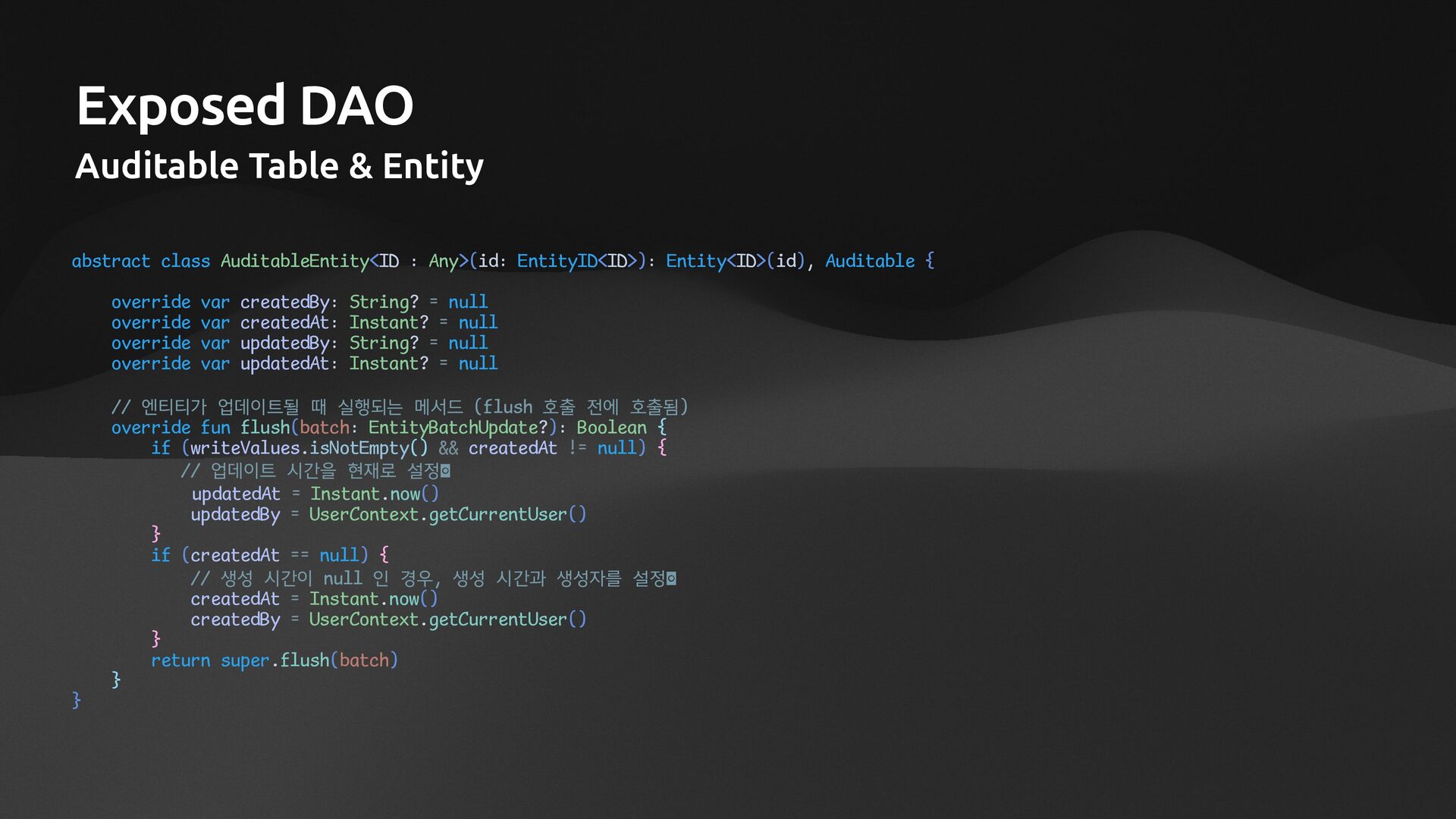 Any>(id: EntityID<ID>): Entity<ID>(id), Auditable { override var createdBy: String? = null override var createdAt: Instant? = null override var updatedBy: String? = null override var updatedAt: Instant? = null // 엔티티가 업데이트될 때 실행되는 메서드 (flush 호출 전에 호출됨) override fun flush(batch: EntityBatchUpdate?): Boolean { if (writeValues.isNotEmpty() && createdAt != null) { // 업데이트 시간을 현재로 설정 updatedAt = Instant.now() updatedBy = UserContext.getCurrentUser() } if (createdAt == null) { // 생성 시간이 null 인 경우, 생성 시간과 생성자를 설정 createdAt = Instant.now() createdBy = UserContext.getCurrentUser() } return super.flush(batch) } }