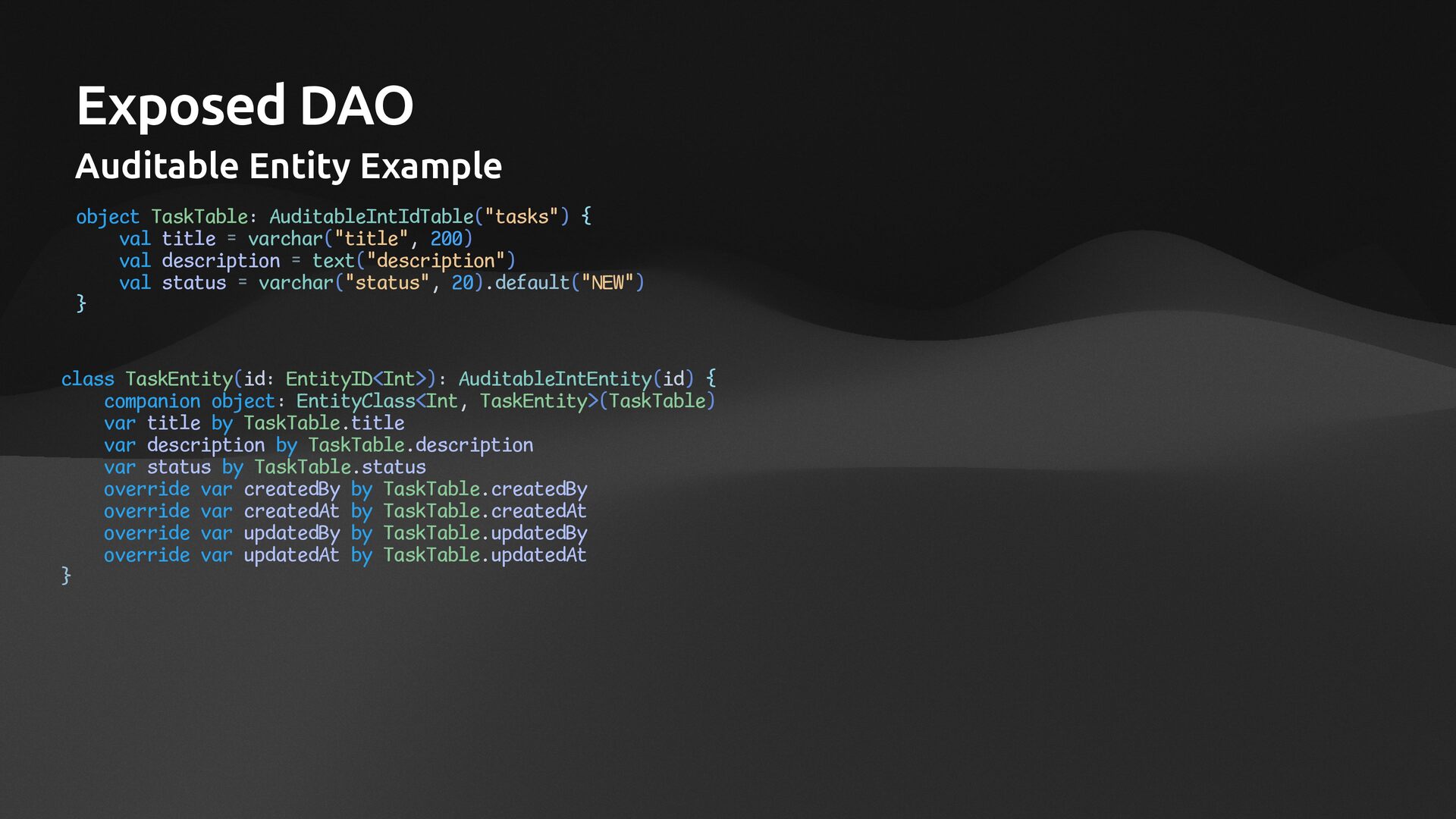 title = varchar("title", 200) val description = text("description") val status = varchar("status", 20).default("NEW") } class TaskEntity(id: EntityID<Int>): AuditableIntEntity(id) { companion object: EntityClass<Int, TaskEntity>(TaskTable) var title by TaskTable.title var description by TaskTable.description var status by TaskTable.status override var createdBy by TaskTable.createdBy override var createdAt by TaskTable.createdAt override var updatedBy by TaskTable.updatedBy override var updatedAt by TaskTable.updatedAt }