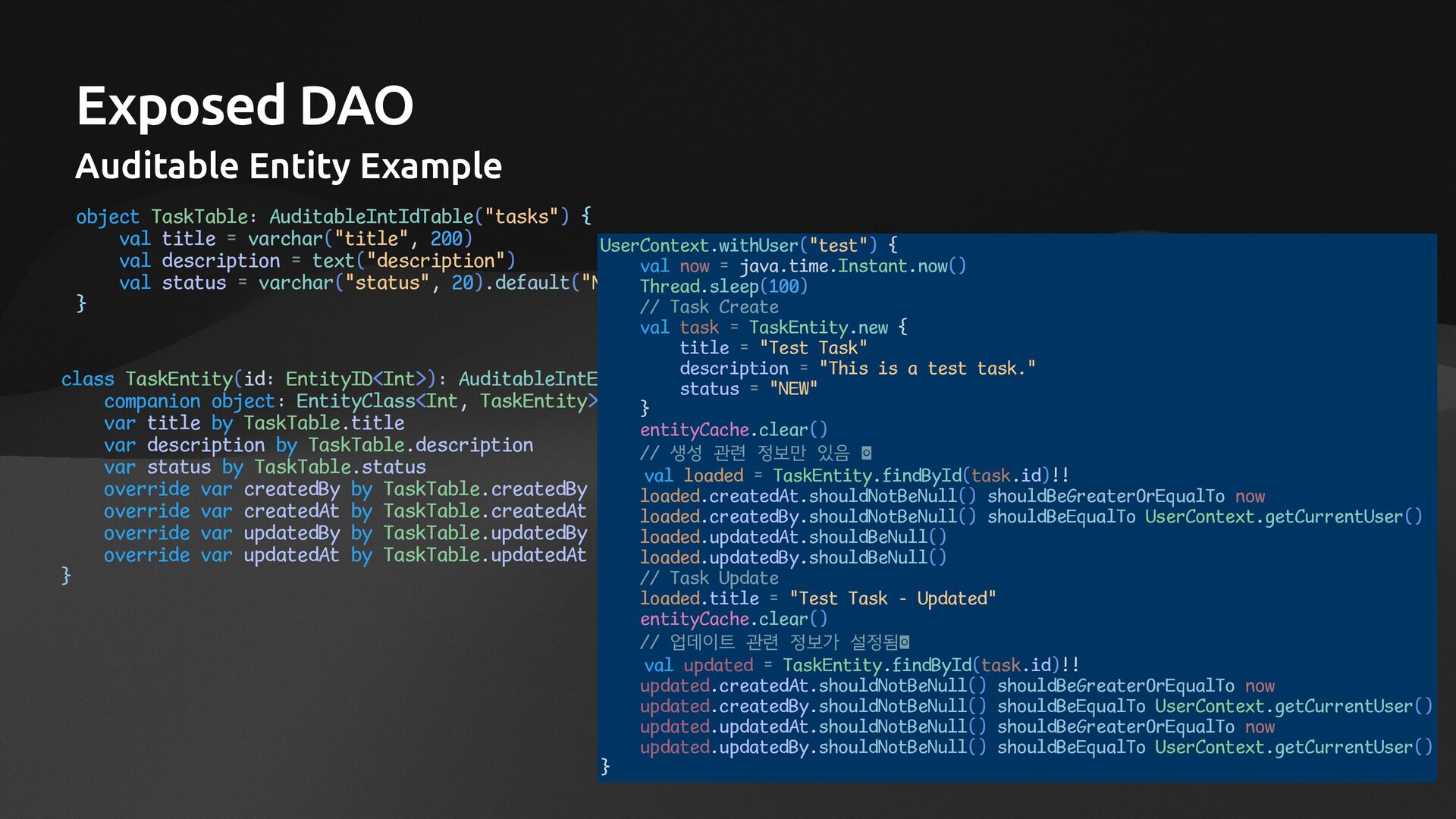 title = varchar("title", 200) val description = text("description") val status = varchar("status", 20).default("NEW") } class TaskEntity(id: EntityID<Int>): AuditableIntEntity(id) { companion object: EntityClass<Int, TaskEntity>(TaskTable) var title by TaskTable.title var description by TaskTable.description var status by TaskTable.status override var createdBy by TaskTable.createdBy override var createdAt by TaskTable.createdAt override var updatedBy by TaskTable.updatedBy override var updatedAt by TaskTable.updatedAt } UserContext.withUser("test") { val now = java.time.Instant.now() Thread.sleep(100) // Task Create val task = TaskEntity.new { title = "Test Task" description = "This is a test task." status = "NEW" } entityCache.clear() // 생성 관련 정보만 있음 val loaded = TaskEntity.findById(task.id)!! loaded.createdAt.shouldNotBeNull() shouldBeGreaterOrEqualTo now loaded.createdBy.shouldNotBeNull() shouldBeEqualTo UserContext.getCurrentUser() loaded.updatedAt.shouldBeNull() loaded.updatedBy.shouldBeNull() // Task Update loaded.title = "Test Task - Updated" entityCache.clear() // 업데이트 관련 정보가 설정됨 val updated = TaskEntity.findById(task.id)!! updated.createdAt.shouldNotBeNull() shouldBeGreaterOrEqualTo now updated.createdBy.shouldNotBeNull() shouldBeEqualTo UserContext.getCurrentUser() updated.updatedAt.shouldNotBeNull() shouldBeGreaterOrEqualTo now updated.updatedBy.shouldNotBeNull() shouldBeEqualTo UserContext.getCurrentUser() }