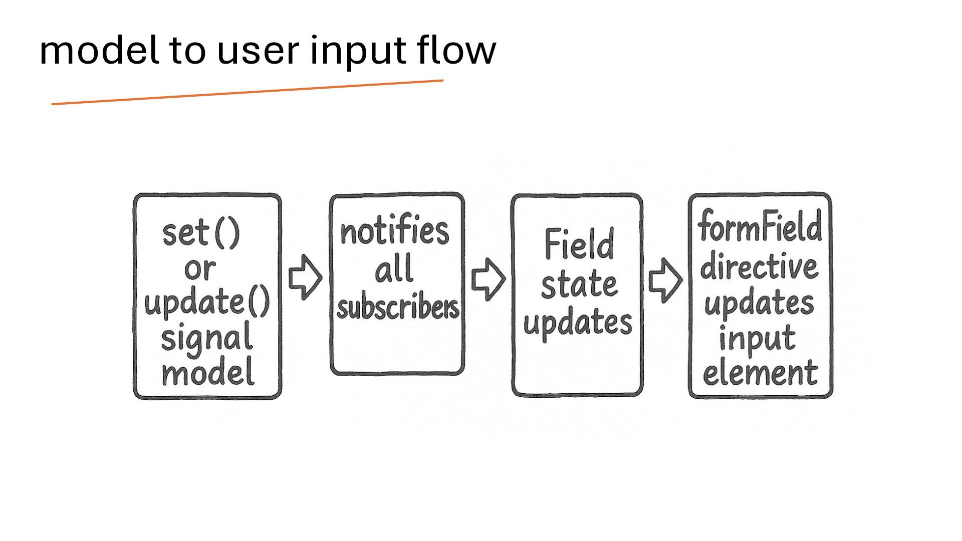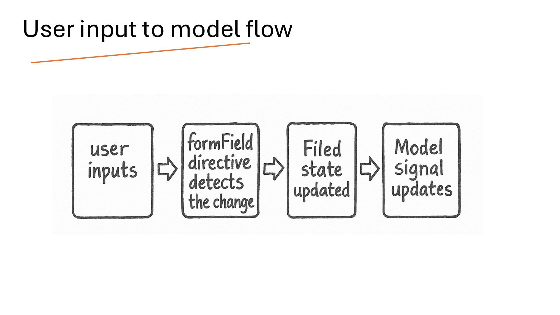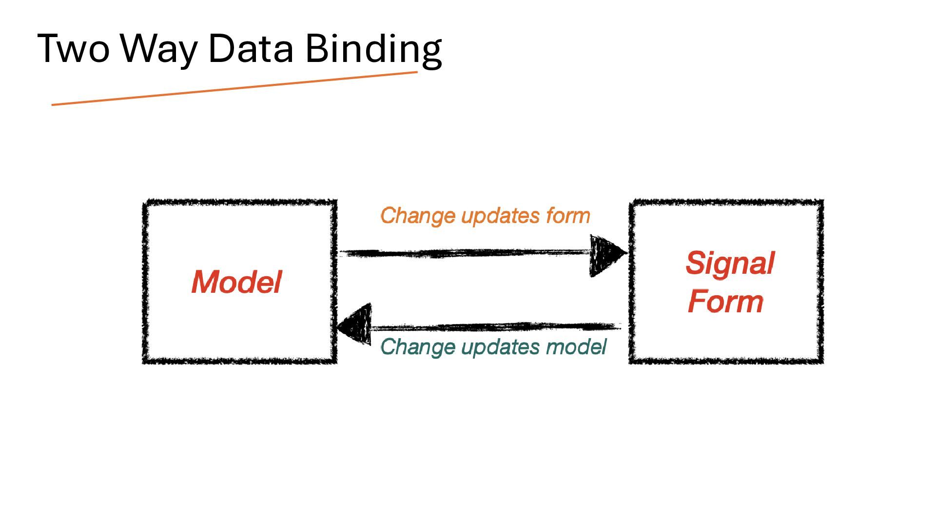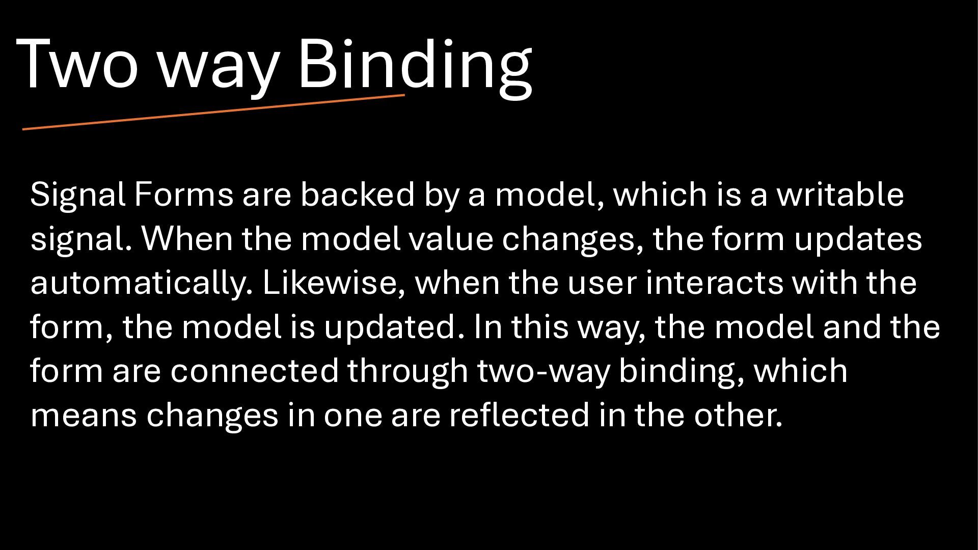 writable signal. When the model value changes, the form updates automatically. Likewise, when the user interacts with the form, the model is updated. In this way, the model and the form are connected through two-way binding, which means changes in one are reflected in the other. Two way Binding