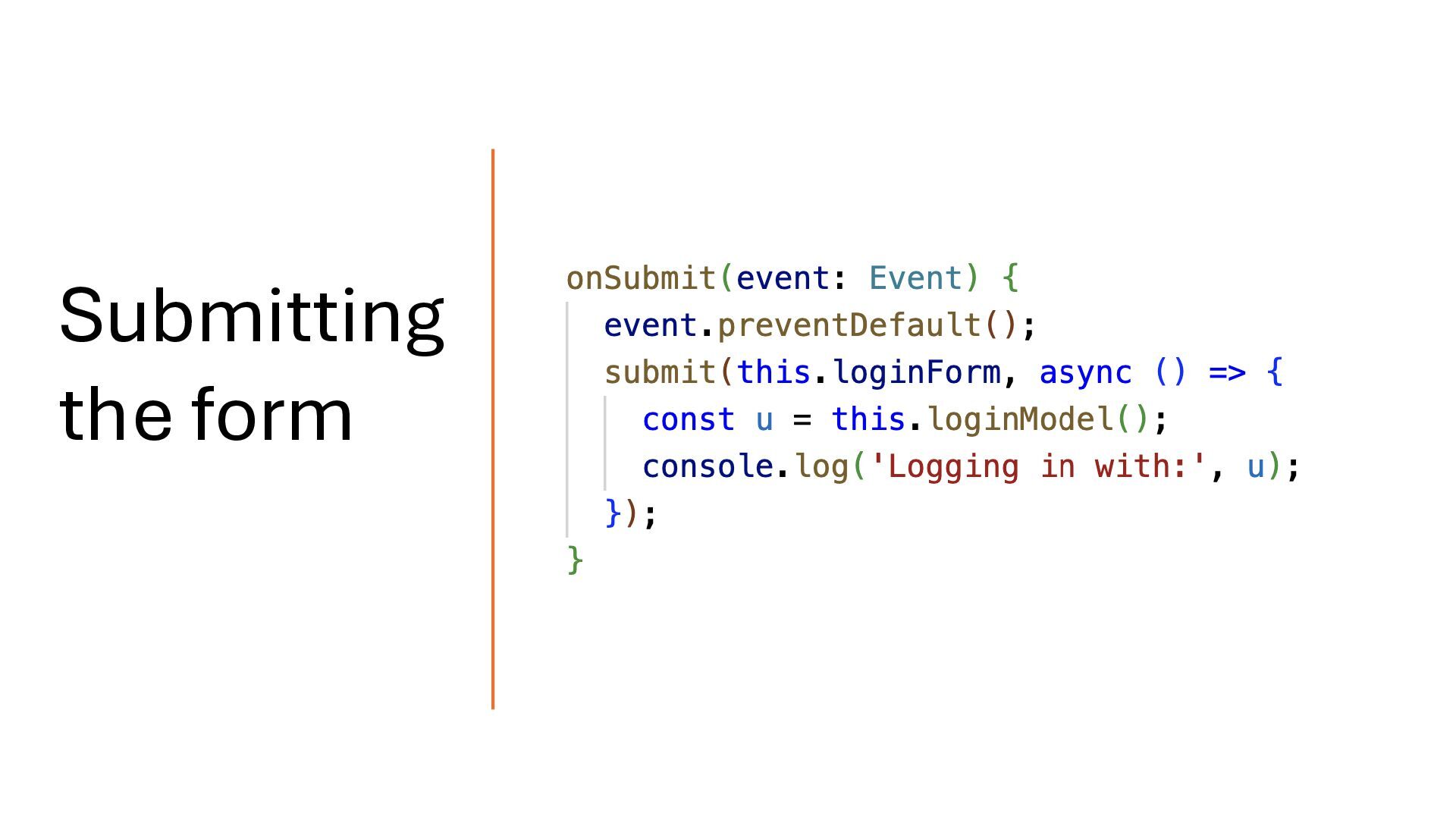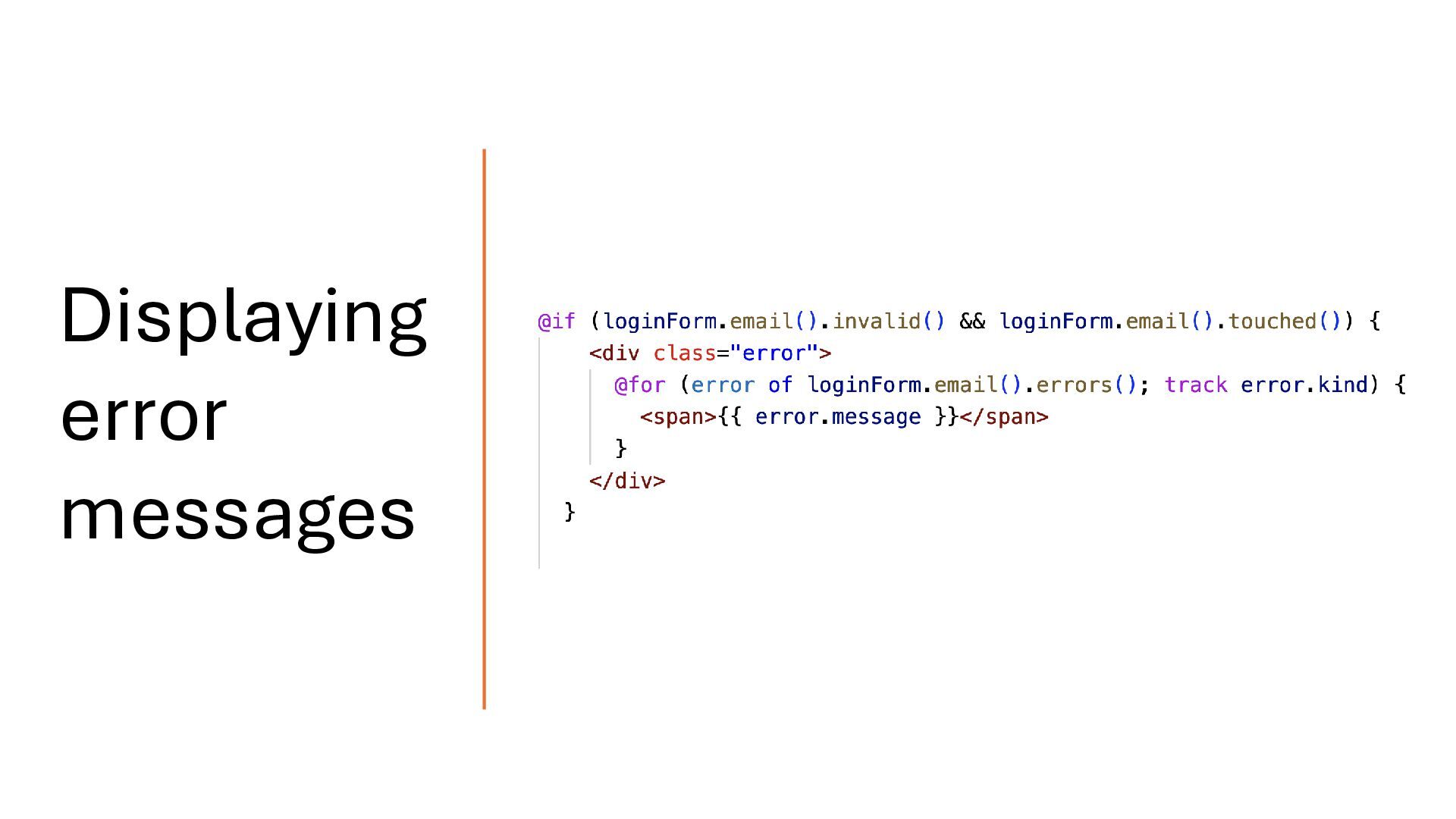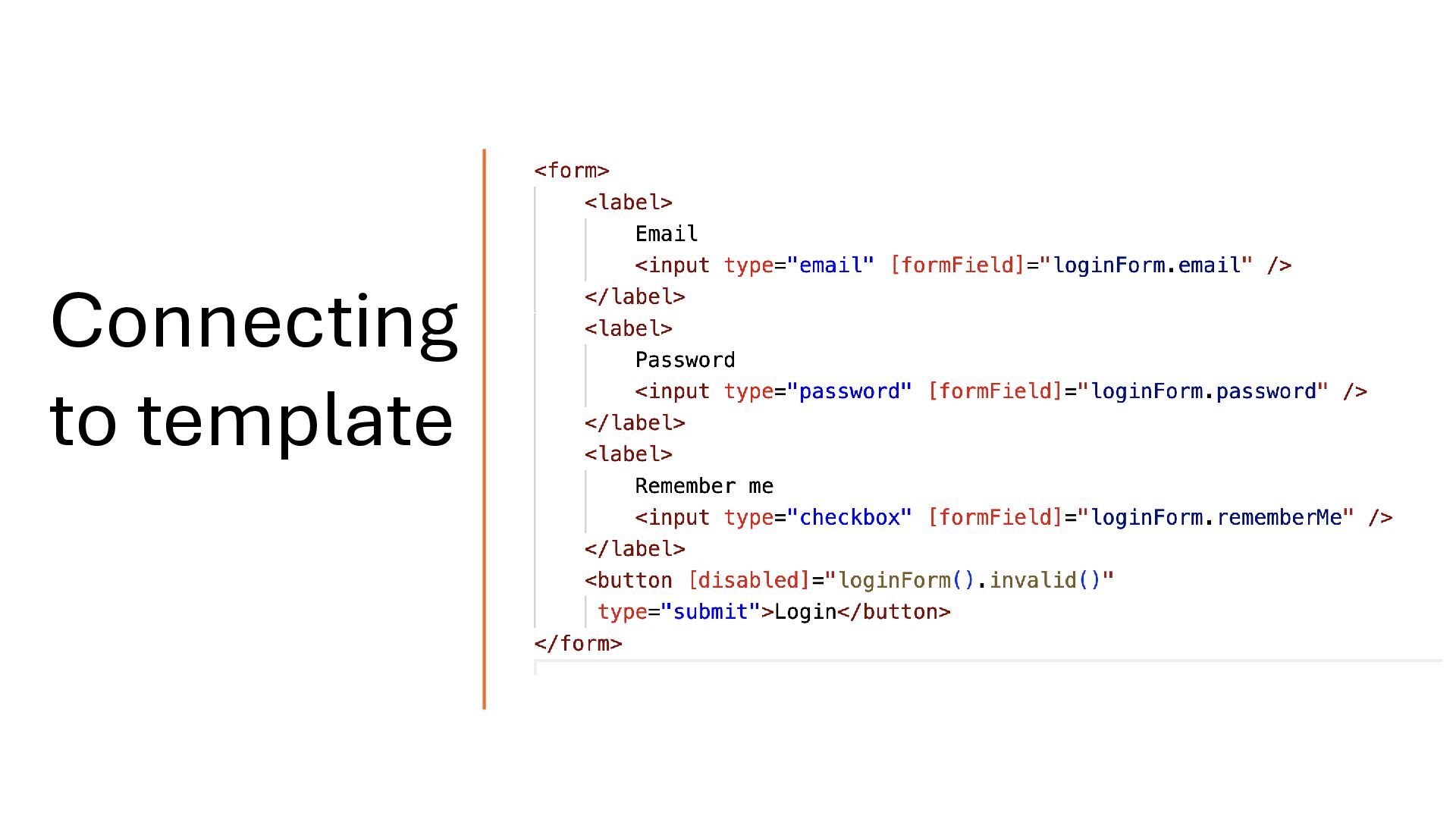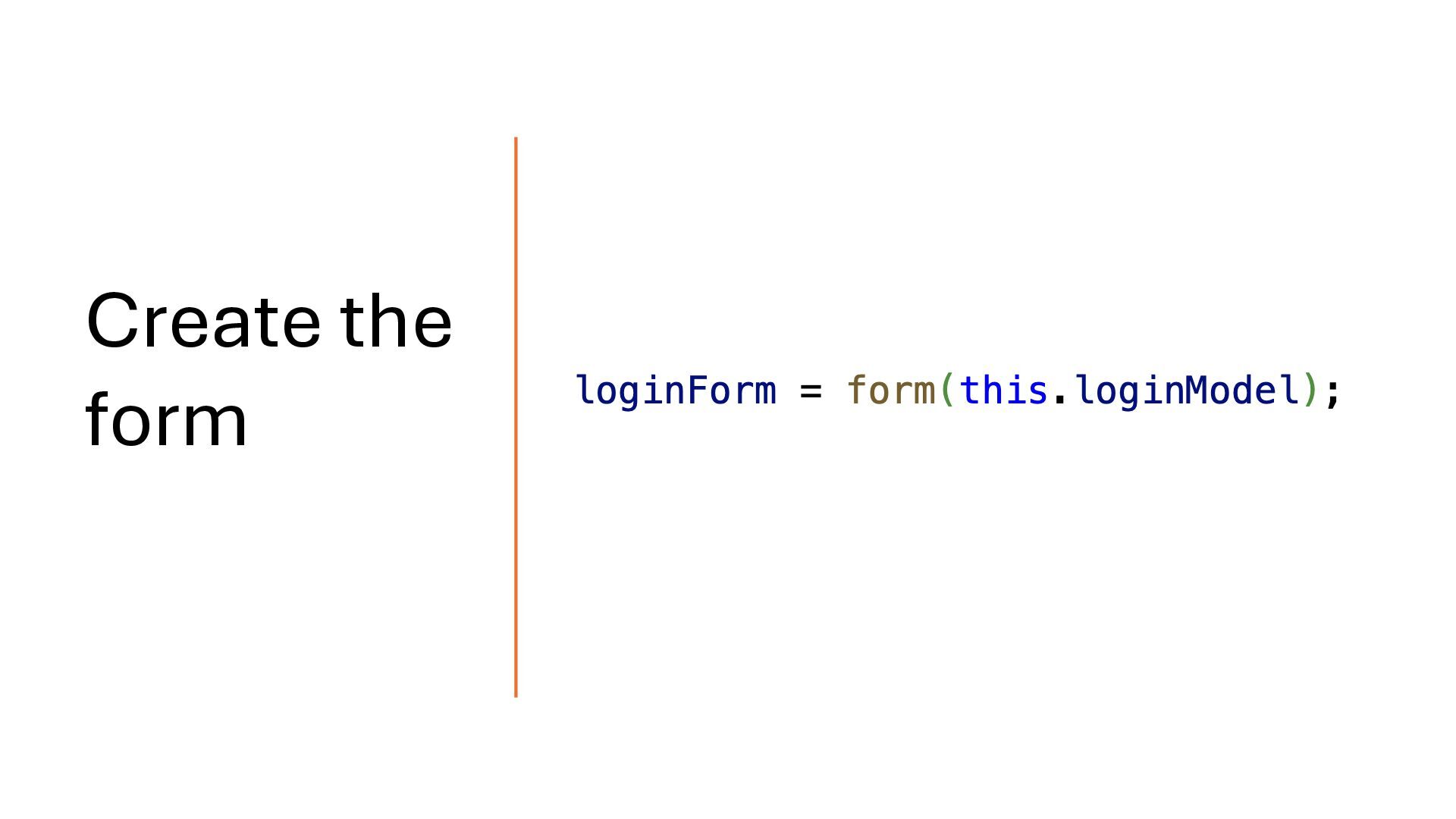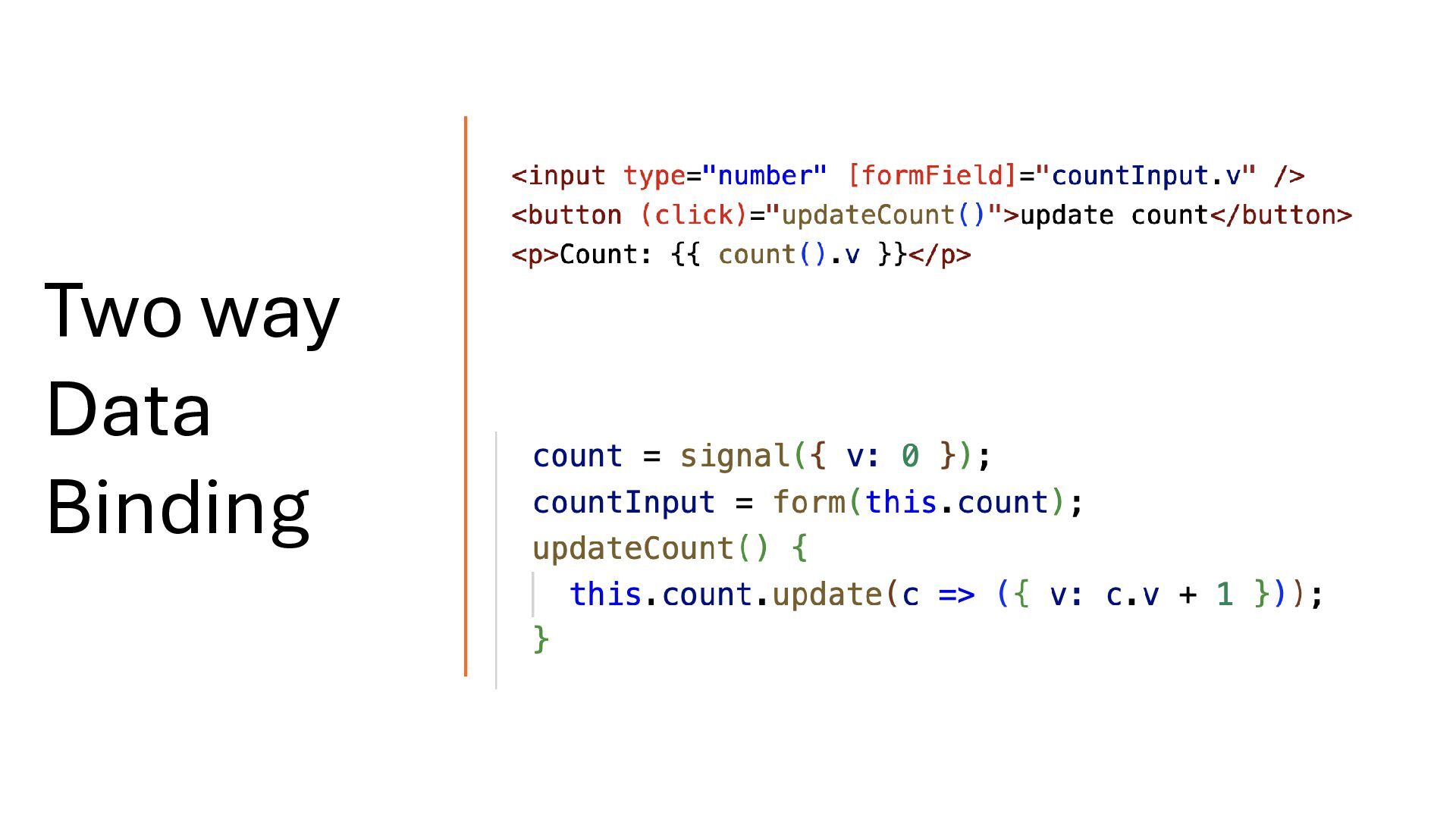writable signal. When the model value changes, the form updates automatically. Likewise, when the user interacts with the form, the model is updated. In this way, the model and the form are connected through two-way binding, which means changes in one are reflected in the other. Two way Binding