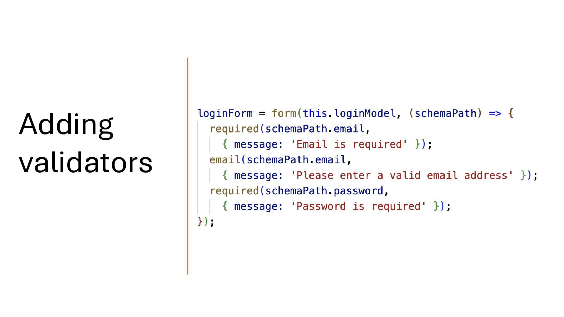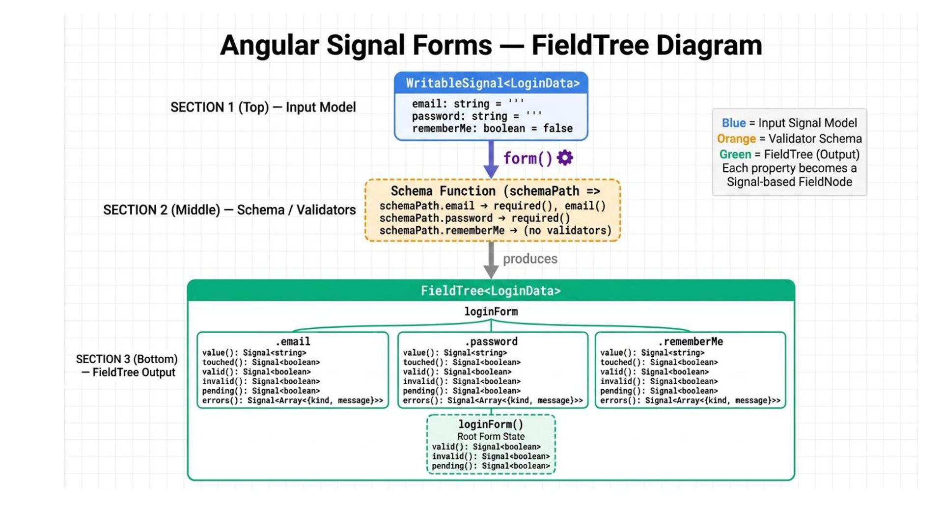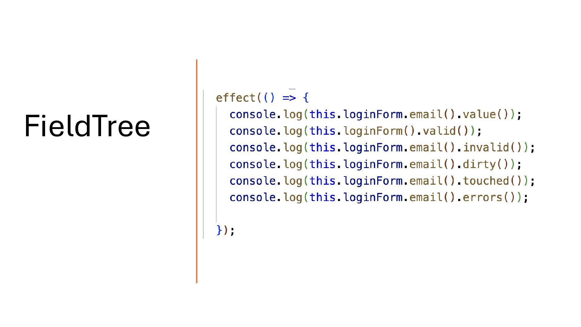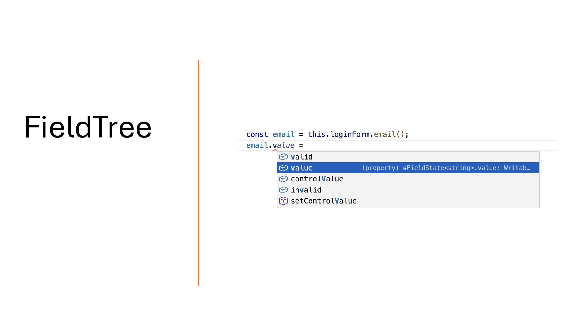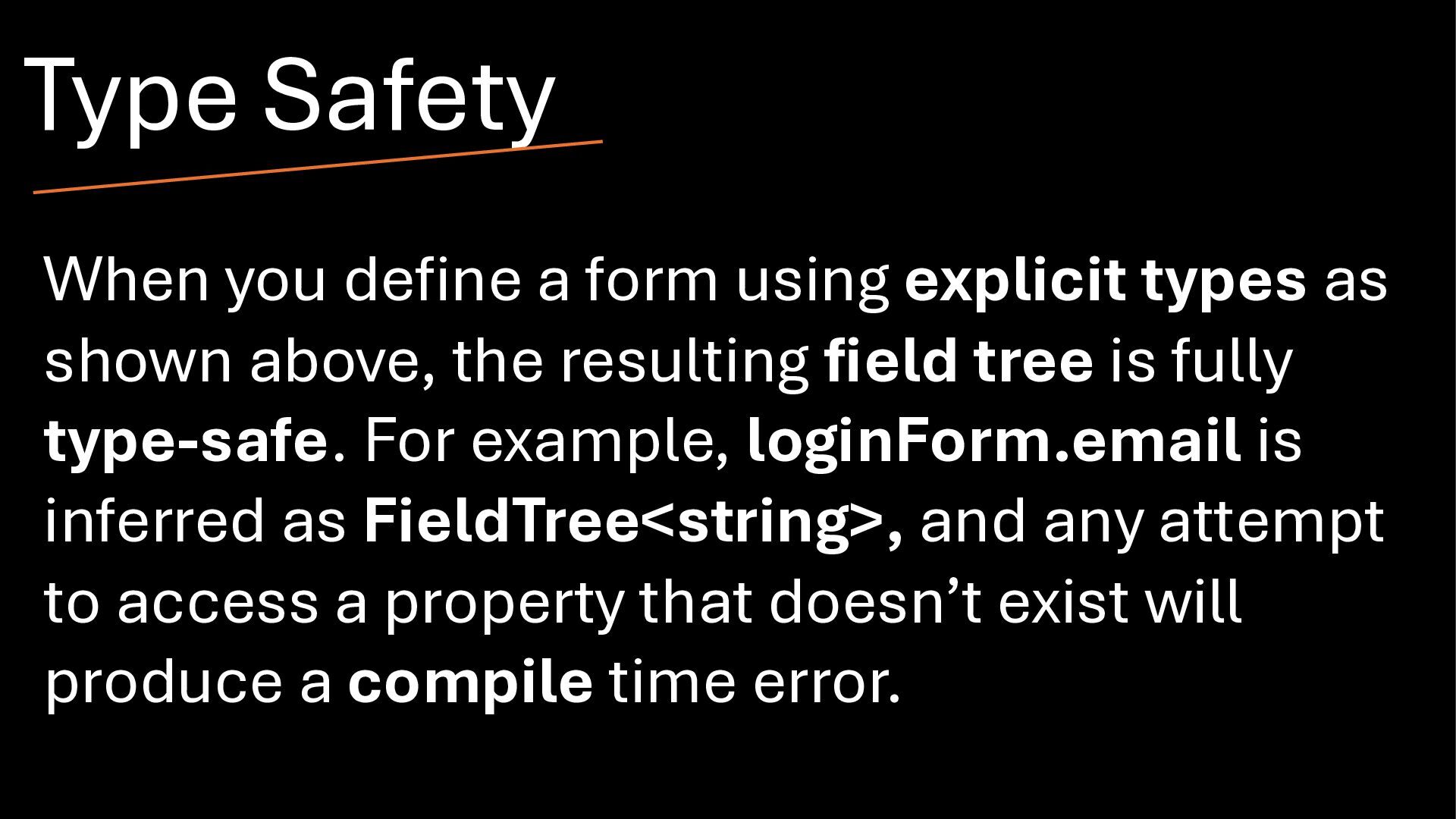 above, the resulting field tree is fully type-safe. For example, loginForm.email is inferred as FieldTree<string>, and any attempt to access a property that doesn’t exist will produce a compile time error. Type Safety