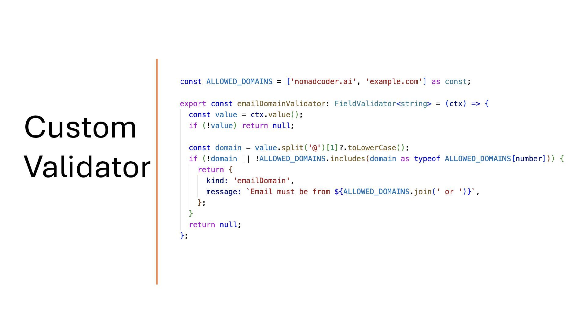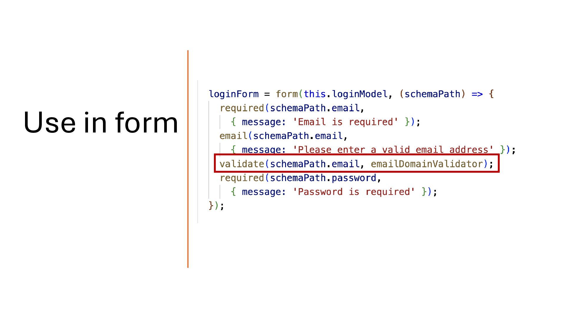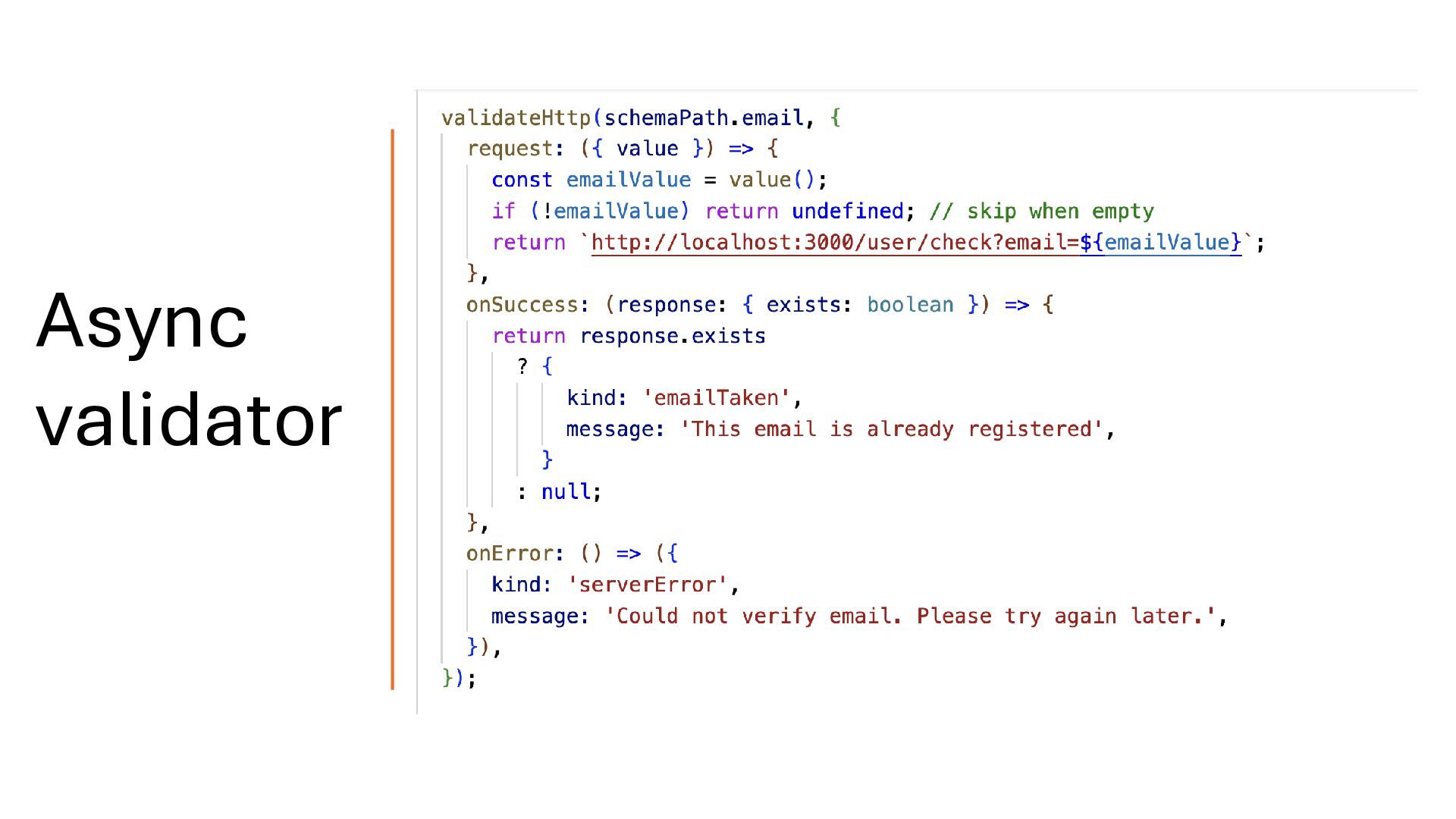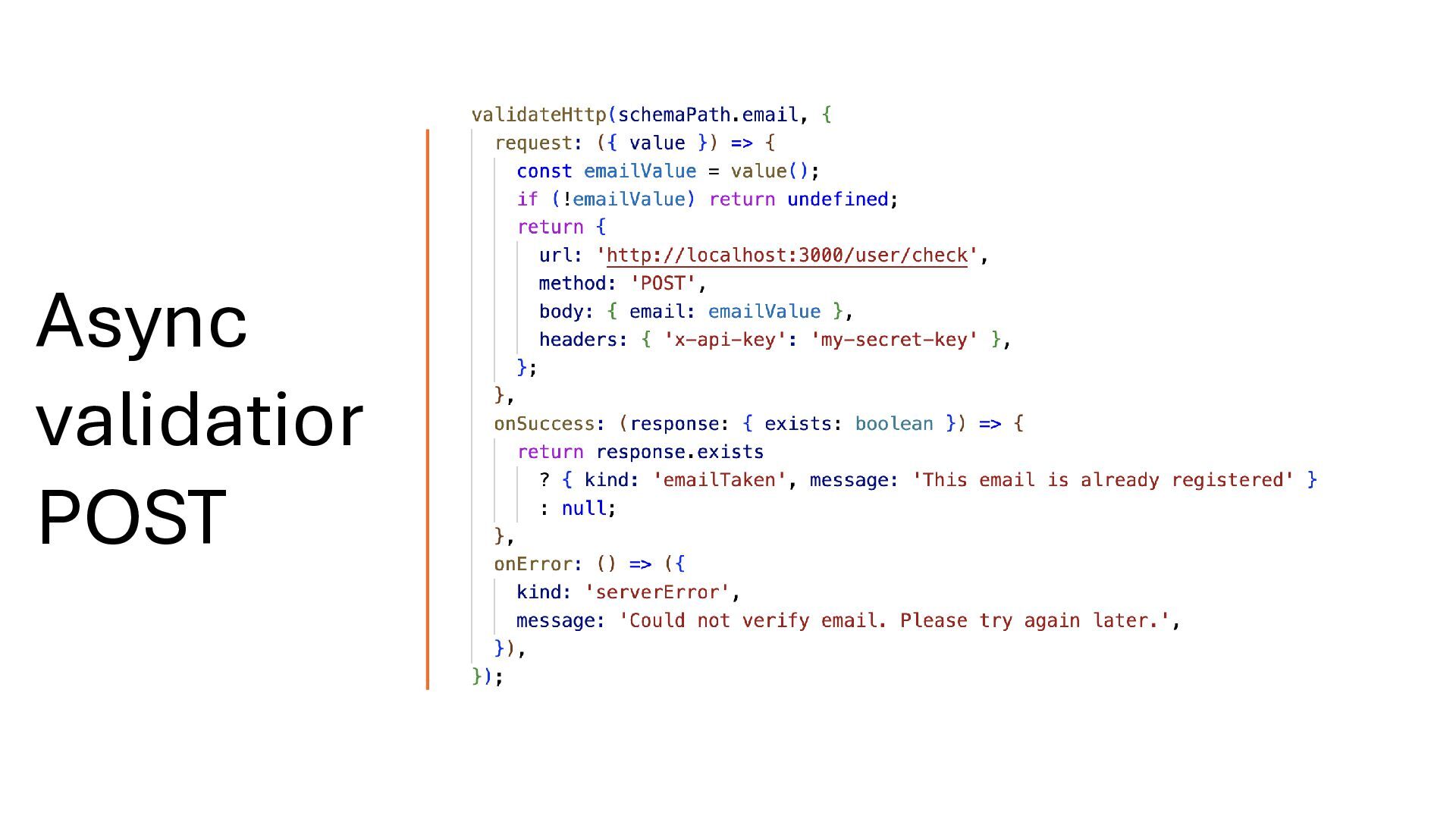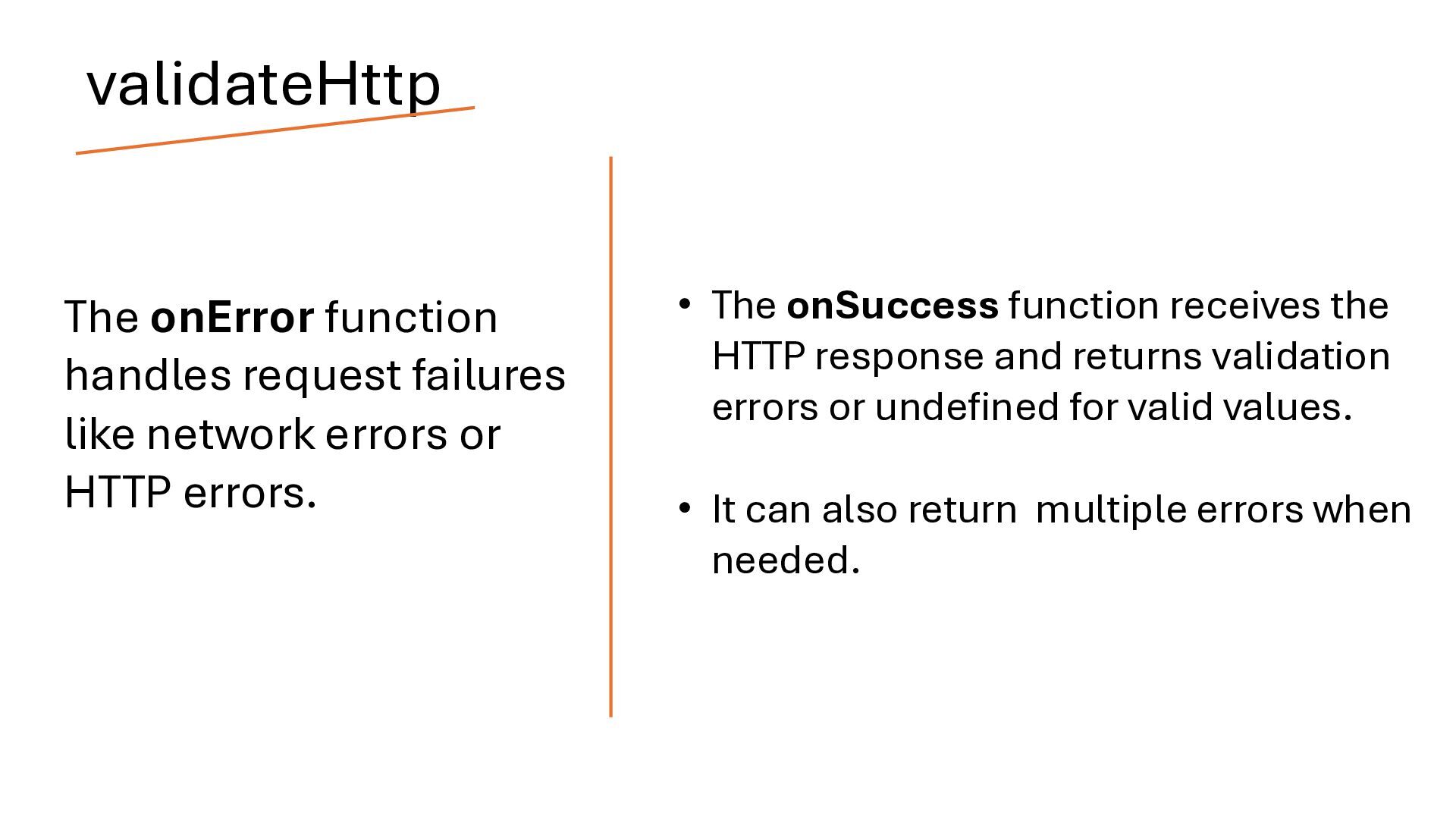 HTTP errors. • The onSuccess function receives the HTTP response and returns validation errors or undefined for valid values. • It can also return multiple errors when needed. validateHttp