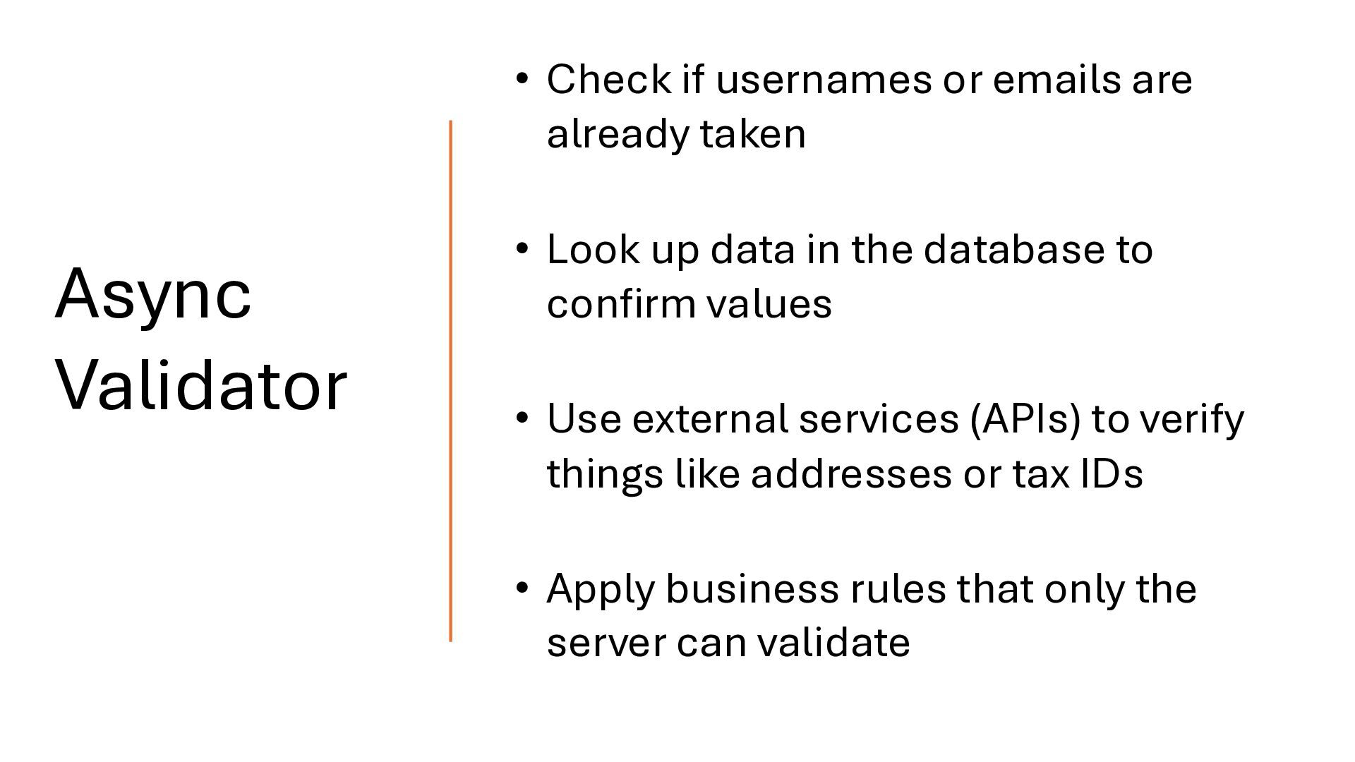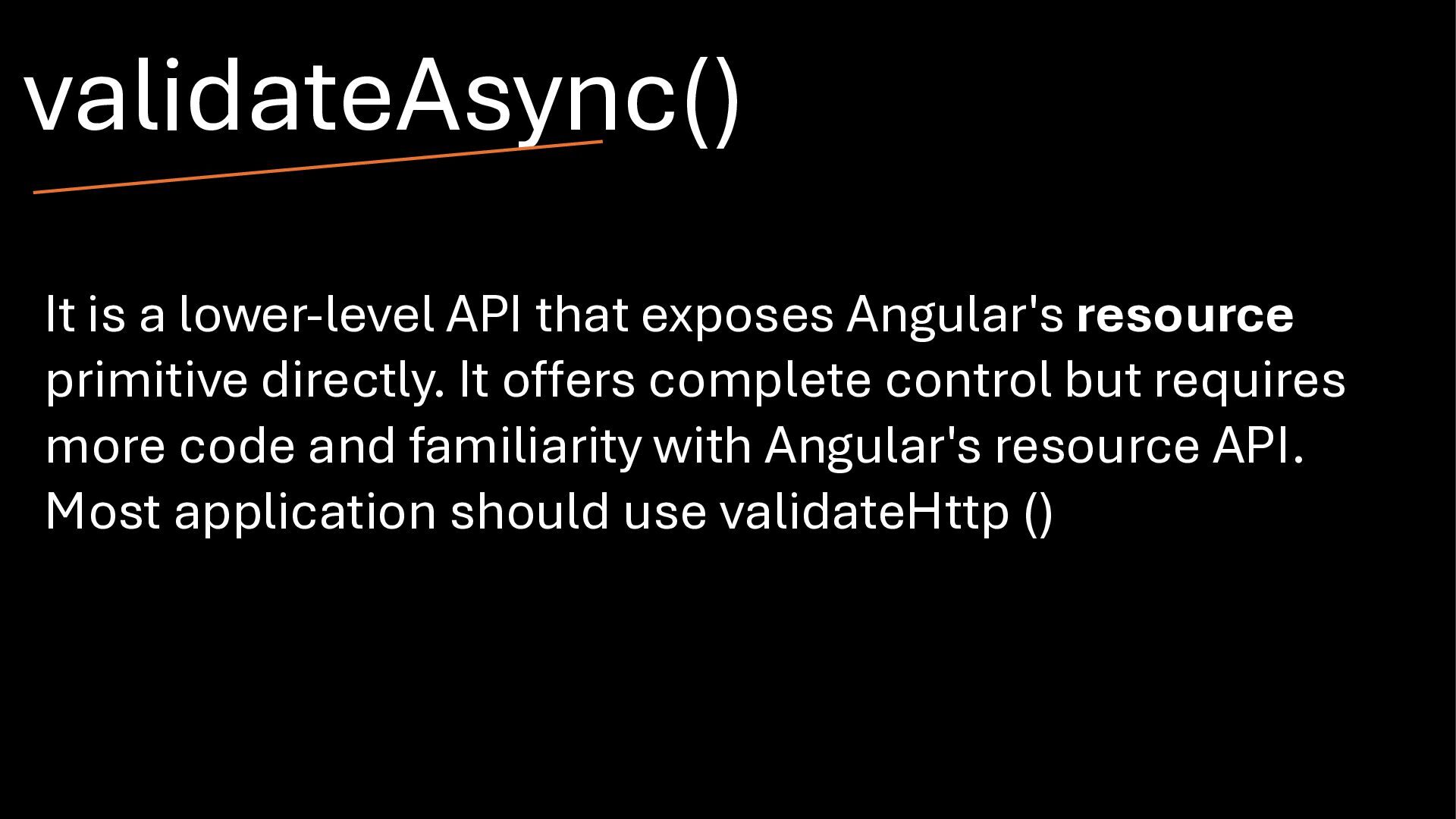 directly. It offers complete control but requires more code and familiarity with Angular's resource API. Most application should use validateHttp () validateAsync()