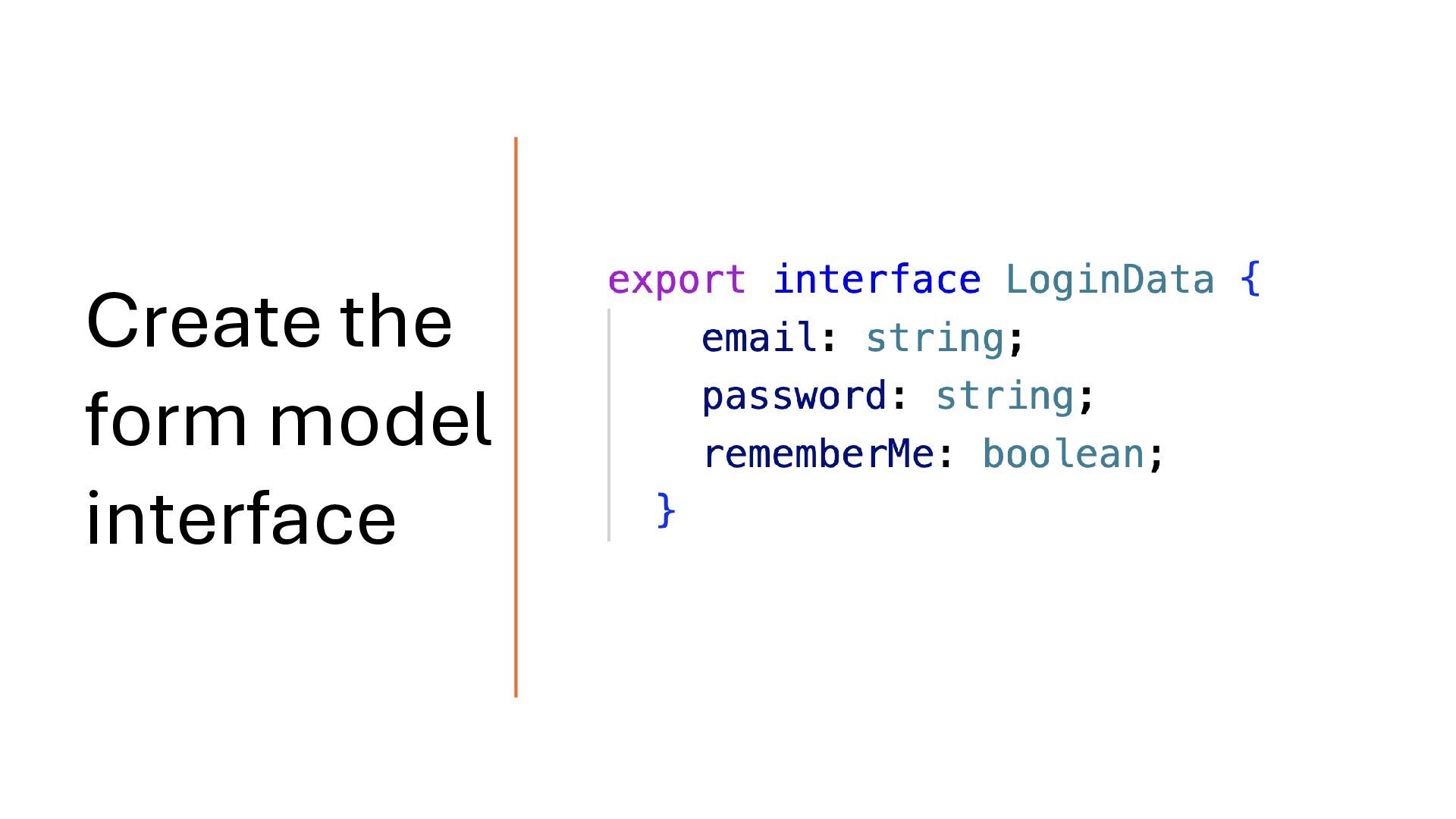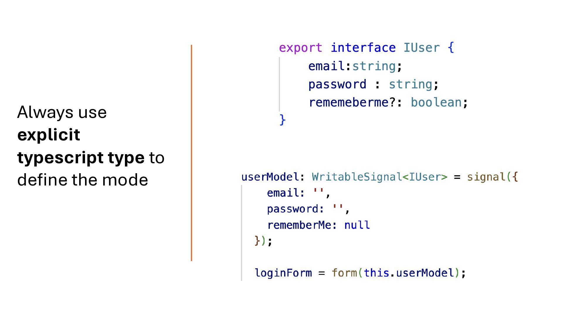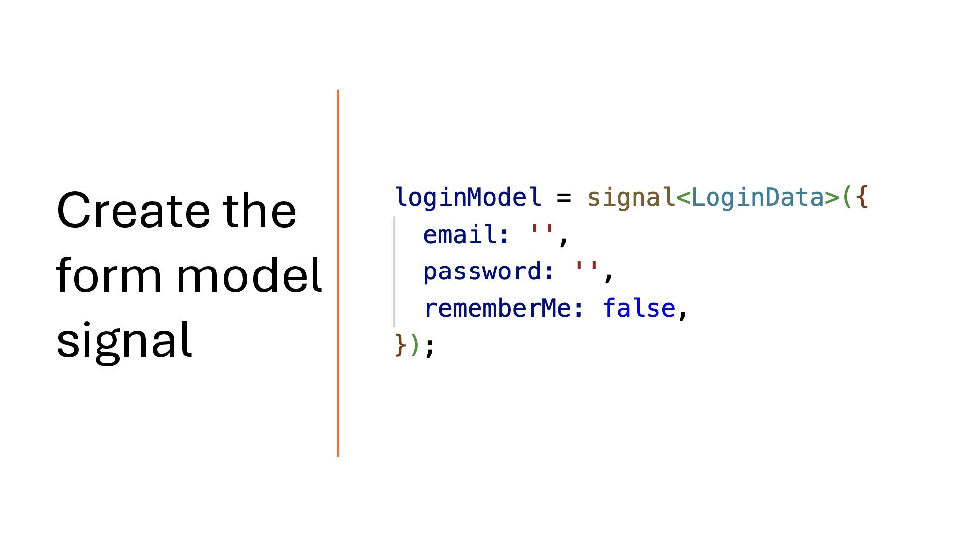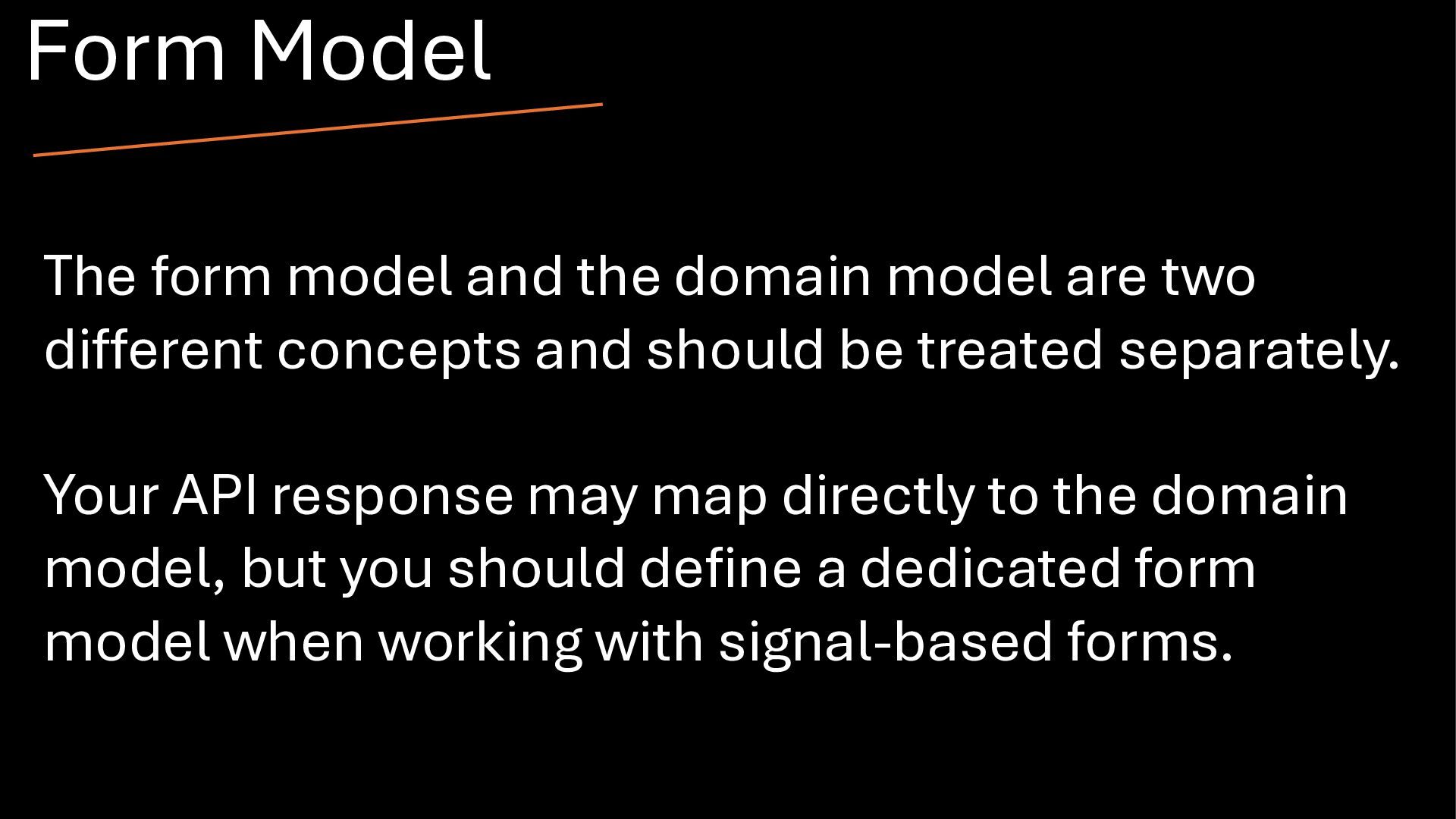 concepts and should be treated separately. Your API response may map directly to the domain model, but you should define a dedicated form model when working with signal-based forms. Form Model