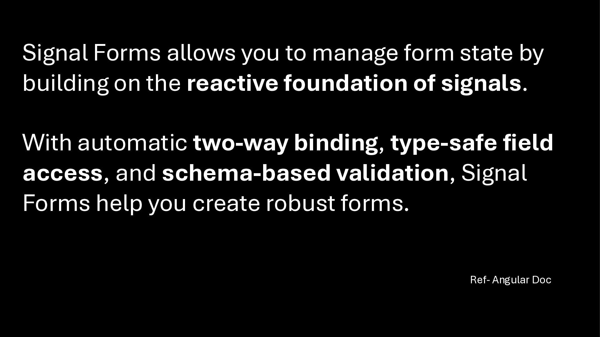 on the reactive foundation of signals. With automatic two-way binding, type-safe field access, and schema-based validation, Signal Forms help you create robust forms. Ref- Angular Doc