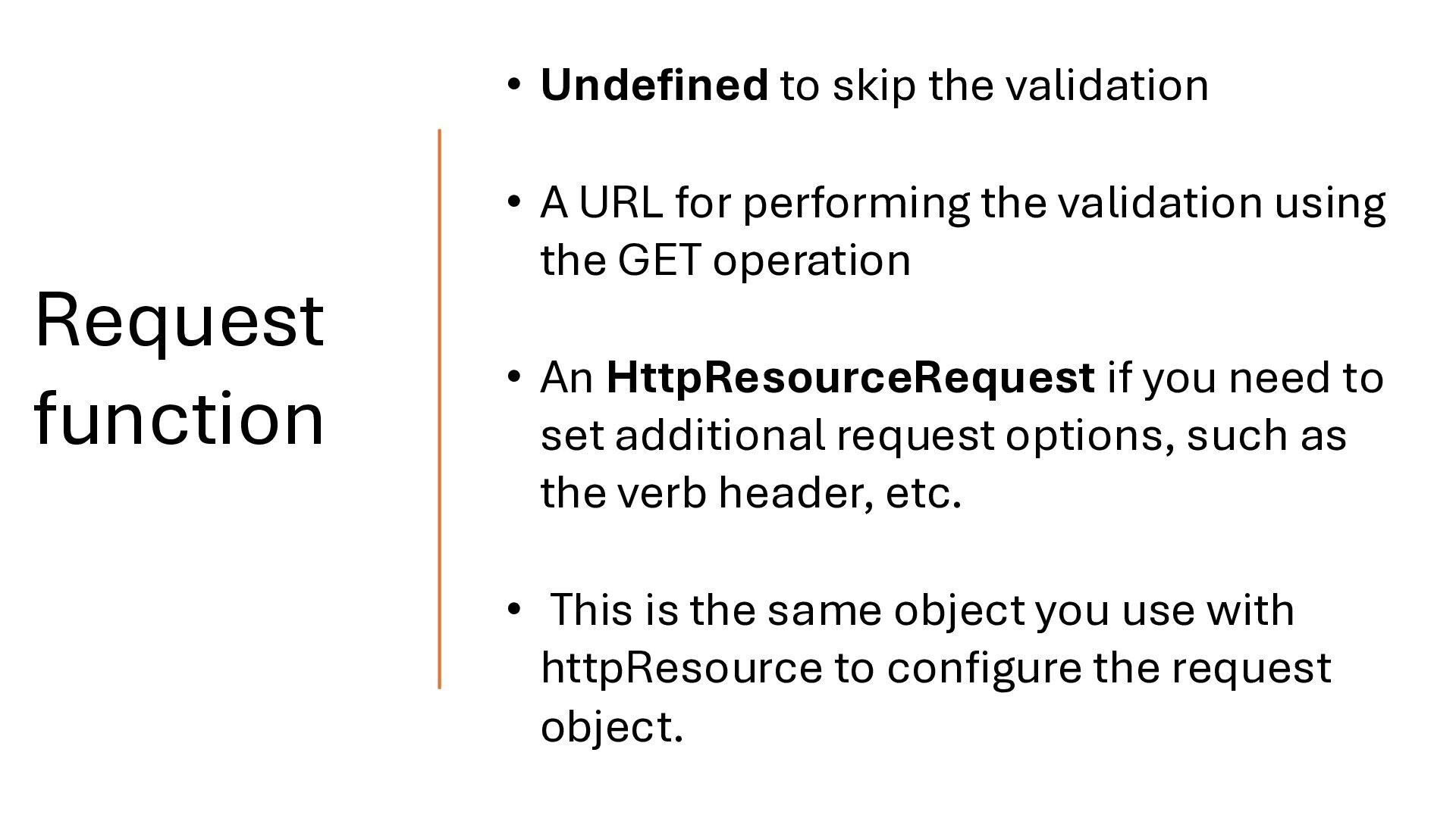 URL for performing the validation using the GET operation • An HttpResourceRequest if you need to set additional request options, such as the verb header, etc. • This is the same object you use with httpResource to configure the request object.