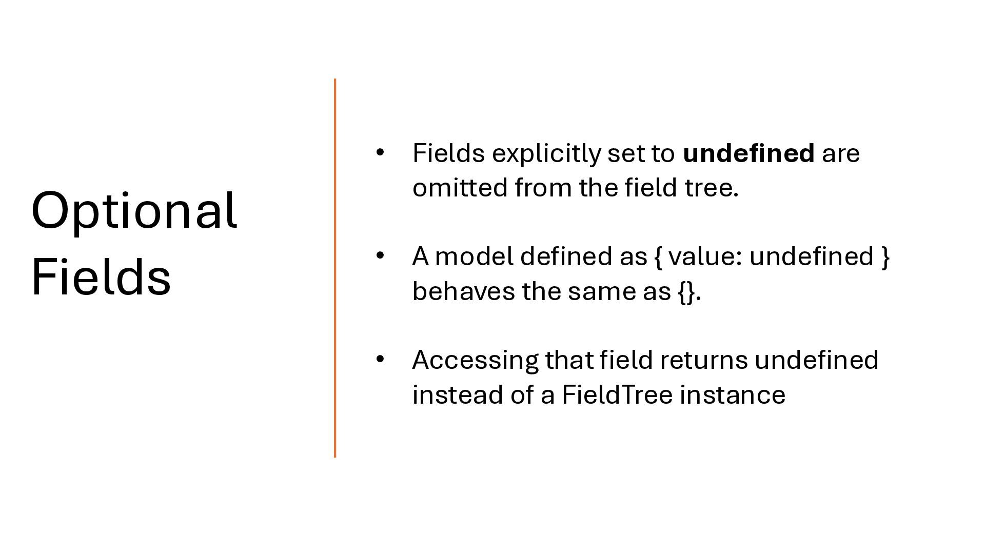 from the field tree. • A model defined as { value: undefined } behaves the same as {}. • Accessing that field returns undefined instead of a FieldTree instance