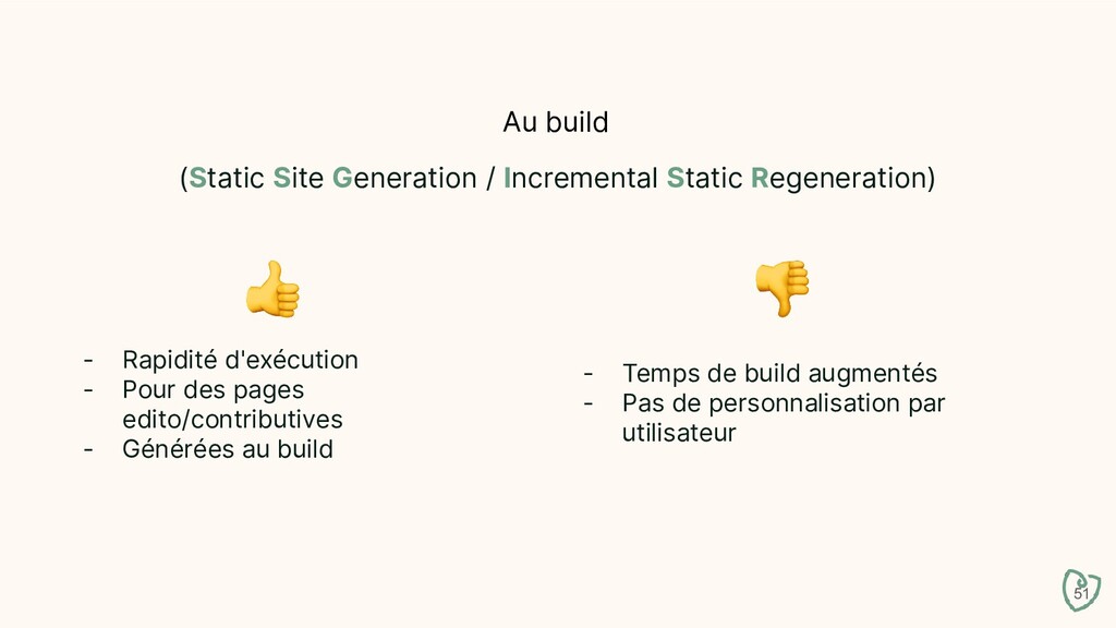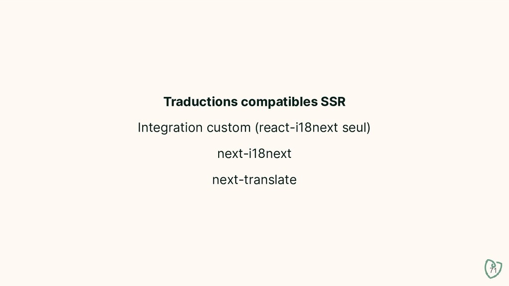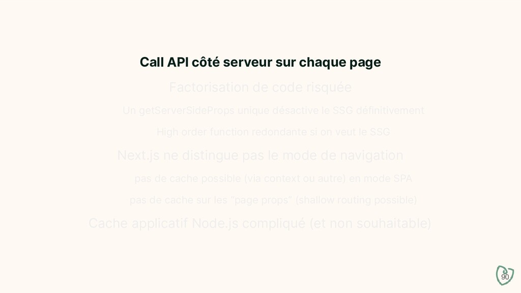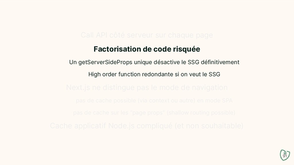 risquée Un getServerSideProps unique désactive le SSG définitivement High order function redondante si on veut le SSG Next.js ne distingue pas le mode de navigation pas de cache possible (via context ou autre) en mode SPA pas de cache sur les “page props” (shallow routing possible) Cache applicatif Node.js compliqué (et non souhaitable) 90