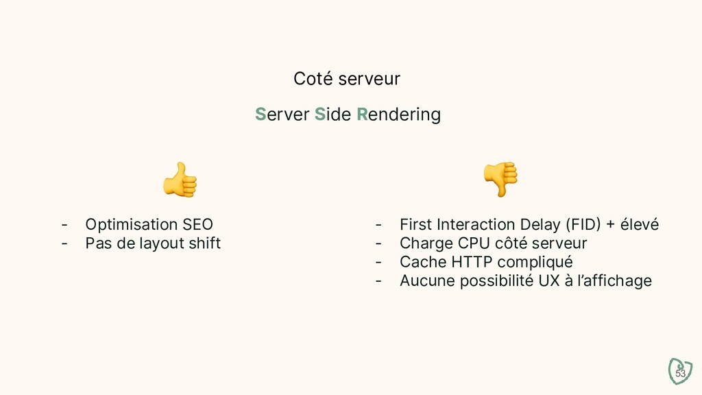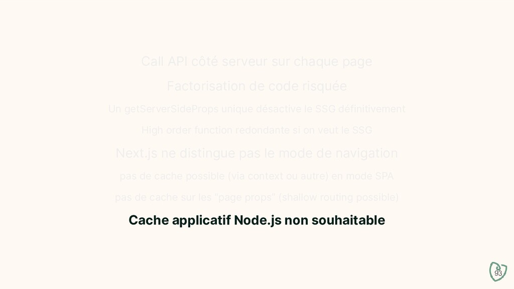 risquée Un getServerSideProps unique désactive le SSG définitivement High order function redondante si on veut le SSG Next.js ne distingue pas le mode de navigation pas de cache possible (via context ou autre) en mode SPA pas de cache sur les “page props” (shallow routing possible) Cache applicatif Node.js compliqué (et non souhaitable) 92