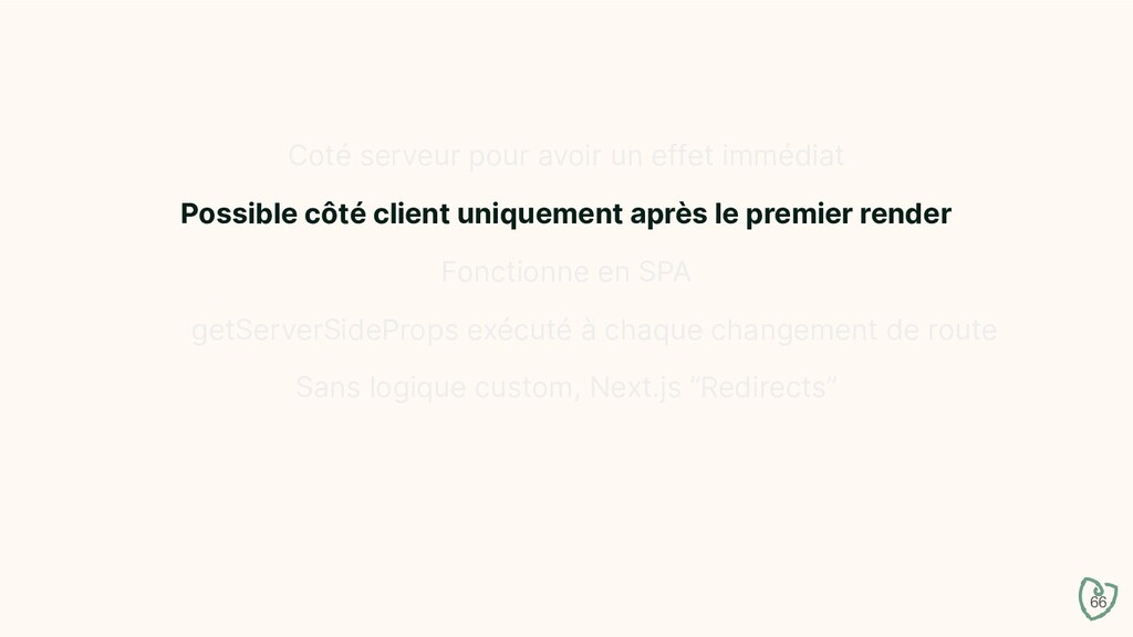 uniquement après le premier render Fonctionne en SPA getServerSideProps exécuté à chaque changement de route Sans logique custom, Next.js “Redirects” 66