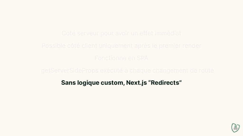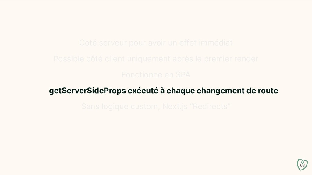 uniquement après le premier render Fonctionne en SPA getServerSideProps exécuté à chaque changement de route Sans logique custom, Next.js “Redirects” 68