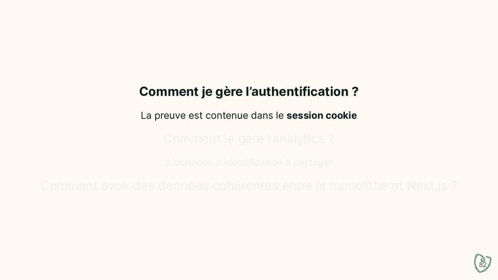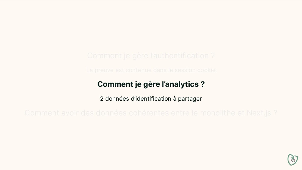 le session cookie Comment je gère l’analytics ? 2 données d’identification à partager Comment avoir des données cohérentes entre le monolithe et Next.js ? 82