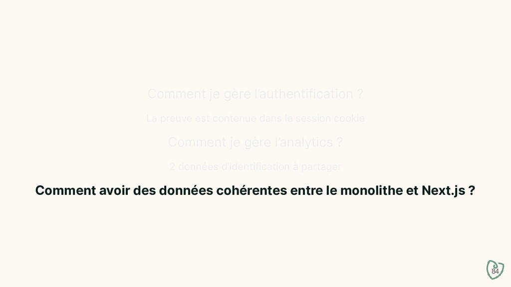 le session cookie Comment je gère l’analytics ? 2 données d’identification à partager Comment avoir des données cohérentes entre le monolithe et Next.js ? 83