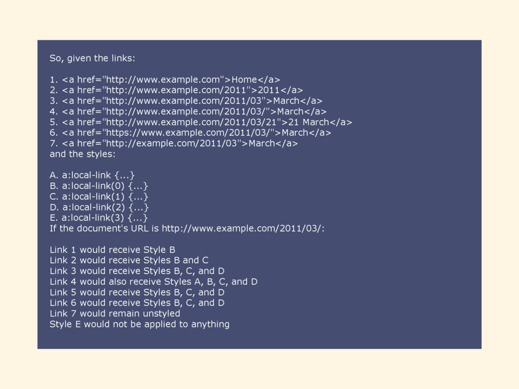 3. <a href="http://www.example.com/2011/03">March</a> 4. <a href="http://www.example.com/2011/03/">March</a> 5. <a href="http://www.example.com/2011/03/21">21 March</a> 6. <a href="https://www.example.com/2011/03/">March</a> 7. <a href="http://example.com/2011/03">March</a> and the styles: A. a:local-link {...} B. a:local-link(0) {...} C. a:local-link(1) {...} D. a:local-link(2) {...} E. a:local-link(3) {...} If the document's URL is http://www.example.com/2011/03/: Link 1 would receive Style B Link 2 would receive Styles B and C Link 3 would receive Styles B, C, and D Link 4 would also receive Styles A, B, C, and D Link 5 would receive Styles B, C, and D Link 6 would receive Styles B, C, and D Link 7 would remain unstyled Style E would not be applied to anything