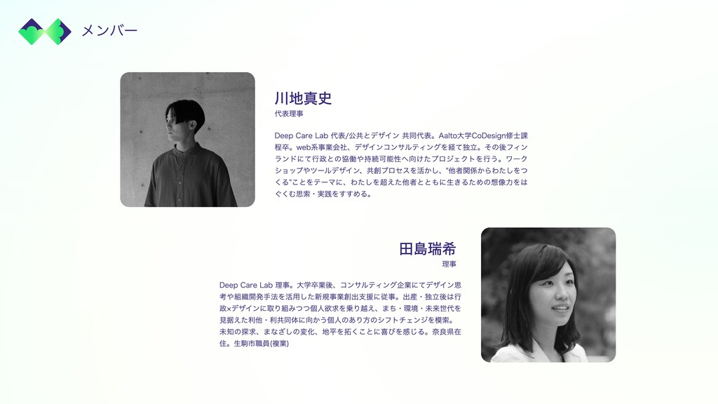 メンバー 代表理事 川地真史 Deep Care Lab 代表/公共とデザイン 共同代表。Aalto大学CoDesign修士課 程卒。web系事業会社、デザインコンサルティングを経て独立。その後フィン ランドにて行政との協働や持続可能性へ向けたプロジェクトを行う。ワーク