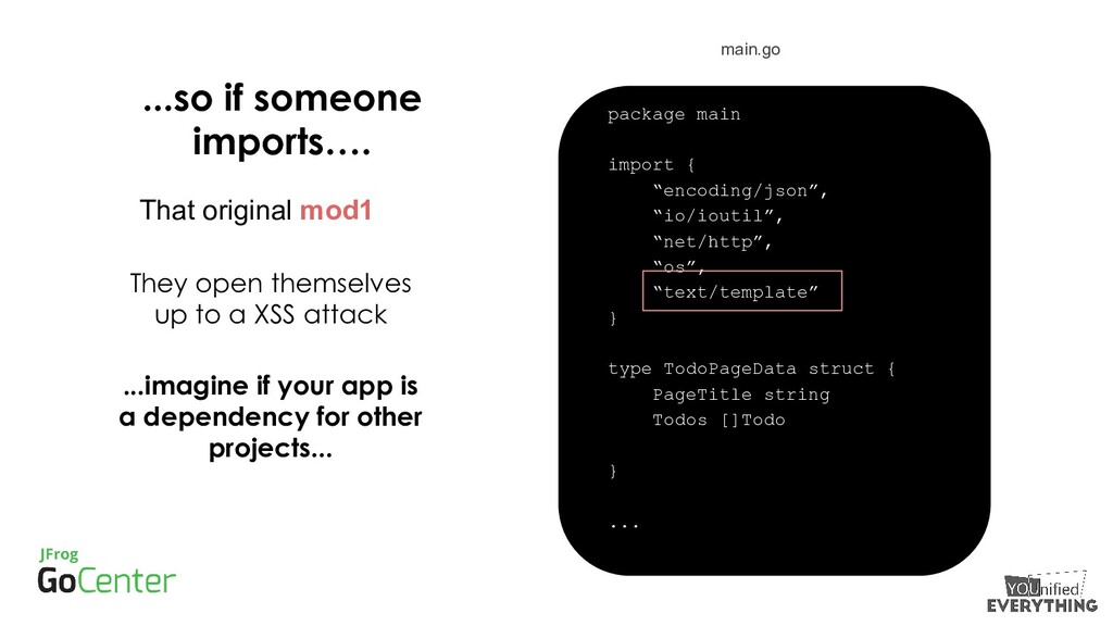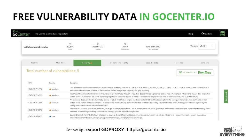 Luckily, GoCenter can now tell you when any Go module has a known vulnerability. We’ve brought the power of JFrog Xray’s security scanning to this reliable repository of Go modules for the Golang developer community.