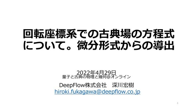 タービンやファンなど回転する羽を持つ流体機械の動的特性を知るには、羽が止まってみえる座標系、つまり回転座標系での流体方程式を調べることが役に立つ。回転座標系の流体方程式の導出をしている文献はほとんどない。2021年に書かれた論文では、デカルト座標からの座標変換をすることで回転座標系の流体方程式を導出しているものがあったが、計算が煩雑であり、幾何学的な意味をつかみにくい。微分形式で運動方程式を与えれば、任意の座標系での表式を簡単に得ることができる。そこで、流体方程式を微分形式で表し、回転座標系の流体方程式の導出を行った。その結果、従来知られていたコリオリ力や遠心力以外にも慣性項があることを見つけた。