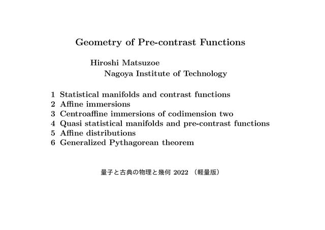 equation: R(X, Y )Z = h(Y, Z)SX − h(X, Z)SY, Codazzi equations: (∇X h)(Y, Z) + h(Y, Z)τ(X) −(∇Y h)(X, Z) + h(X, Z)τ(Y ) = −h(T ∇(X, Y ), Z), (∇X S)(Y ) + τ(Y )SX − (∇Y S)(X) − τ(X)SY = −S(T ∇(X, Y )), Ricci equation: h(X, SY ) − (∇X τ)(Y ) − h(Y, SX) + (∇Y τ)(X) = τ(T ∇(X, Y )). Proposition 5.4 (Haba (2020)) M : simply connected. ∇ : an affine connection, S : a (1, 1)-tensor field h : a (0, 2)-tensor field, τ : a 1-form ∇, h, S and τ satisfy fundamental equations =⇒ ∃{ω, ξ} : an affine distribution which induces ∇, h, S and τ. Theorem 5.5 (Haba (2020)) (1) {ω, ξ} : nondegenerate, equiaffine =⇒ (M, ∇, h) : 1-conformally partially flat quasi statistical manifold. (2) {ω, ξ} : symmetric, nondegenerate, equiaffine =⇒ (M, ∇, h) : 1-conformally partially flat SMAT. If M is simply connected, the converses also hold