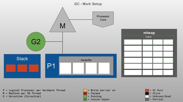 Thread M = Machine per OS Thread G = Goroutine (Coroutine) mcache mheap mspan mspan mspan mspan mspan mspan Stack = Write barrier on = Paused = Running = noscan mspan = GC Root = Alive = Unknown/Dead = Partial GC - Marking P1 M G2 Processor Core P = Logical Processor per Hardware Thread M = Machine per OS Thread G = Goroutine (Coroutine) mcache Stack All Grey objects are scanned and all white object can be collected = Write barrier on = Paused = Running = GC Root = Alive = Unknown/Dead = Partial