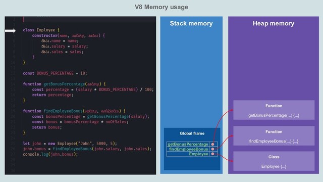 findEmployeeBonus Employee BONUS_PERCENTAGE 10 john Function getBonusPercentage(...) {...} Function findEmployeeBonus(...) {...} Class Employee {...} Object name “John” salary 5000 sales 5 bonus undefined findEmployeeBonus salary 5000 noOfSales 5 bonusPercentage undefined bonus undefined getBonusPercentage salary 5000 percentage 500 return 500