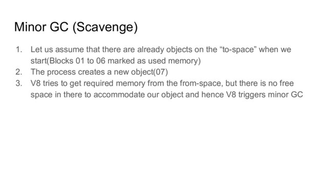 have passed and there are more objects on the “from-space” now(Blocks 07 to 09 marked as used memory) 2. The process creates a new object(10) 3. V8 tries to get required memory from the from-space, but there is no free space in there to accommodate our object and hence V8 triggers second minor GC