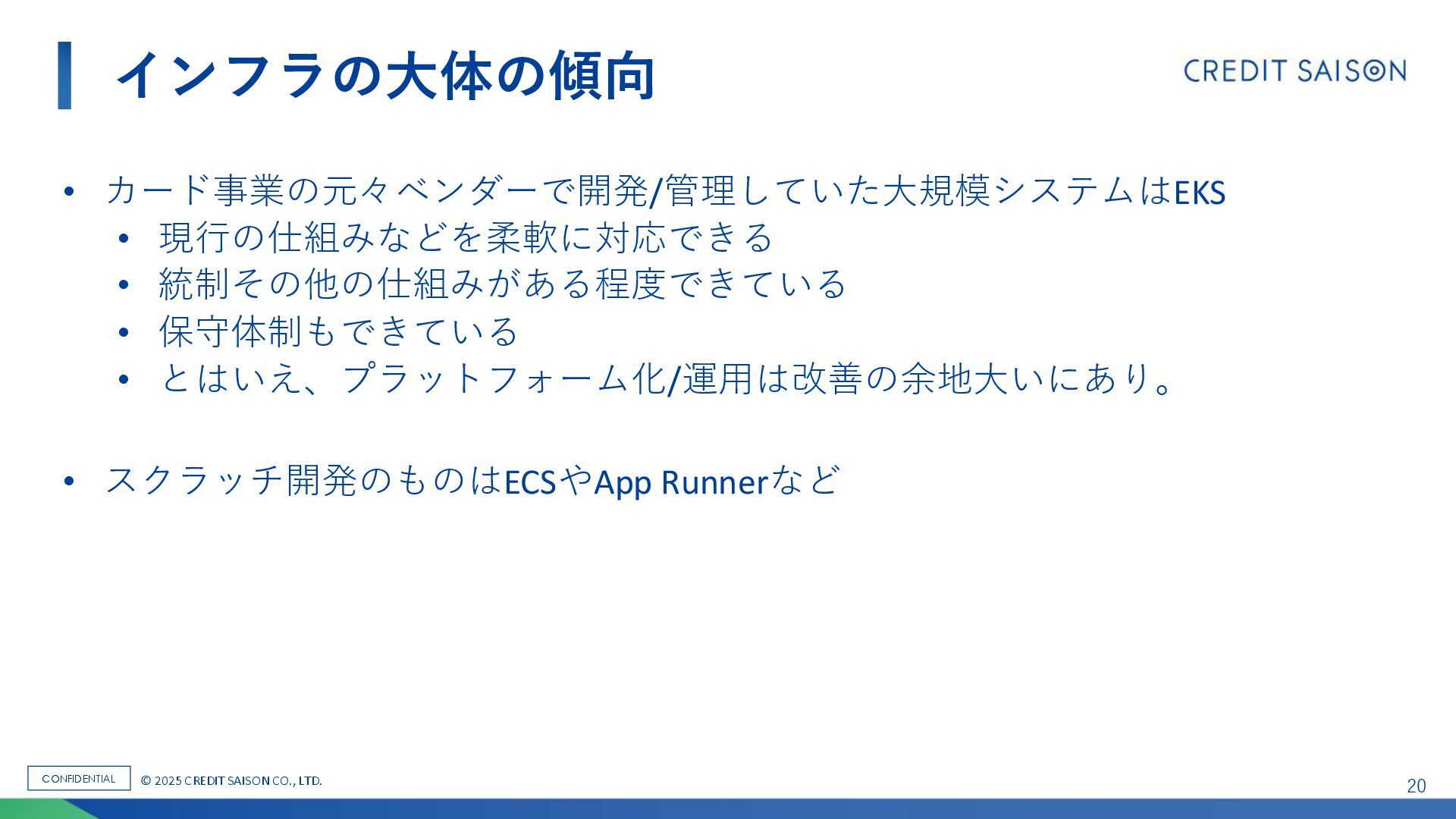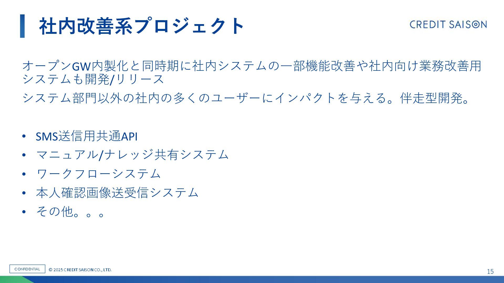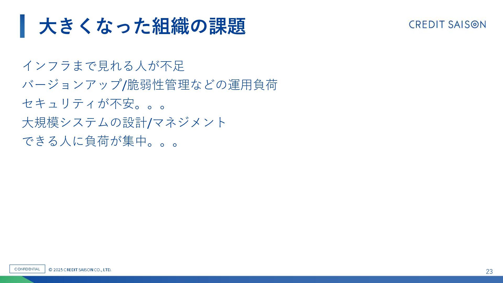 これまで構築してきたシステムを概観するとともに、組織の大規模化に伴って、さまざまな課題があり、共通プラットフォームや分業、プロセスなどの必要性も見えてきました。