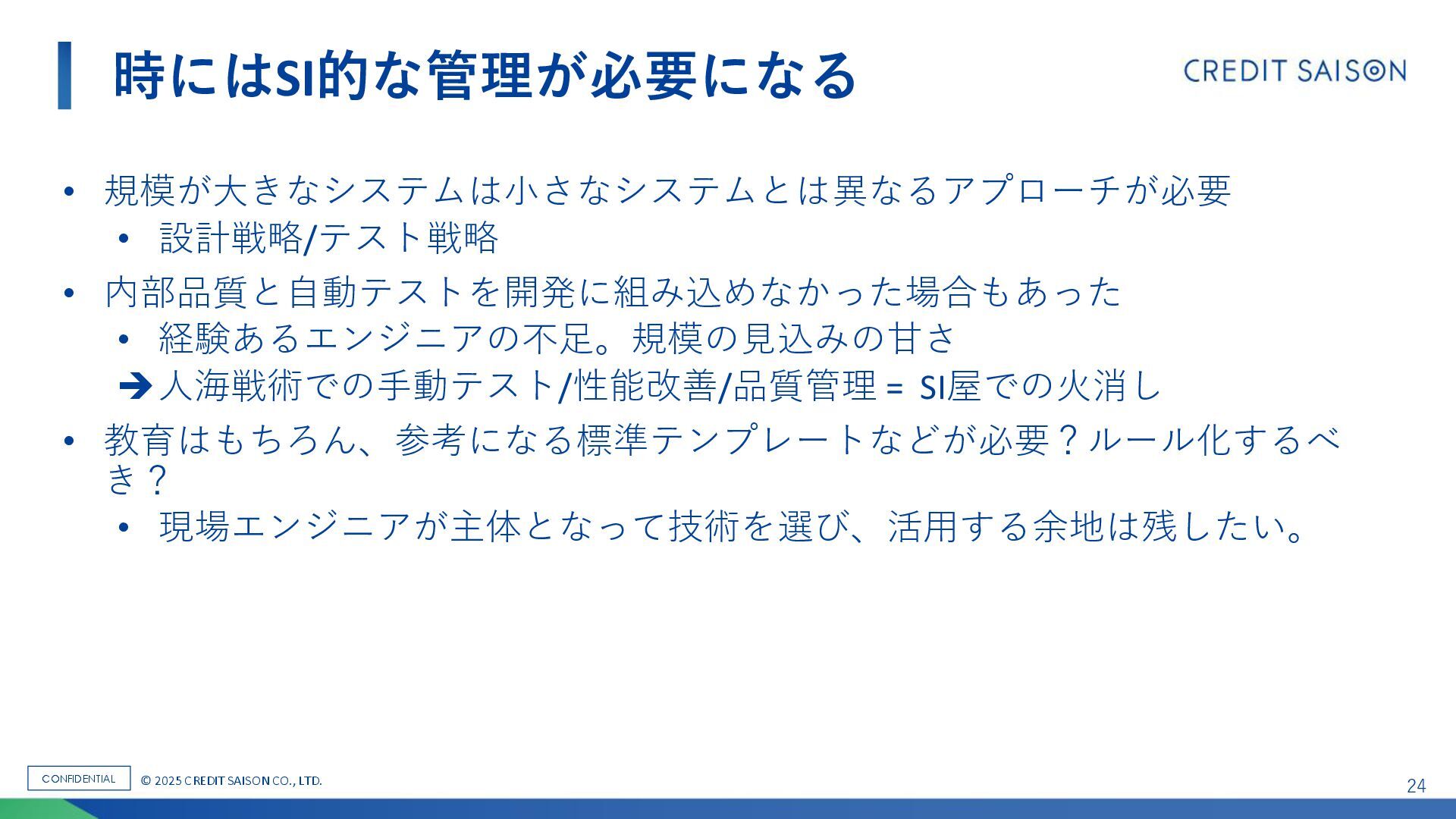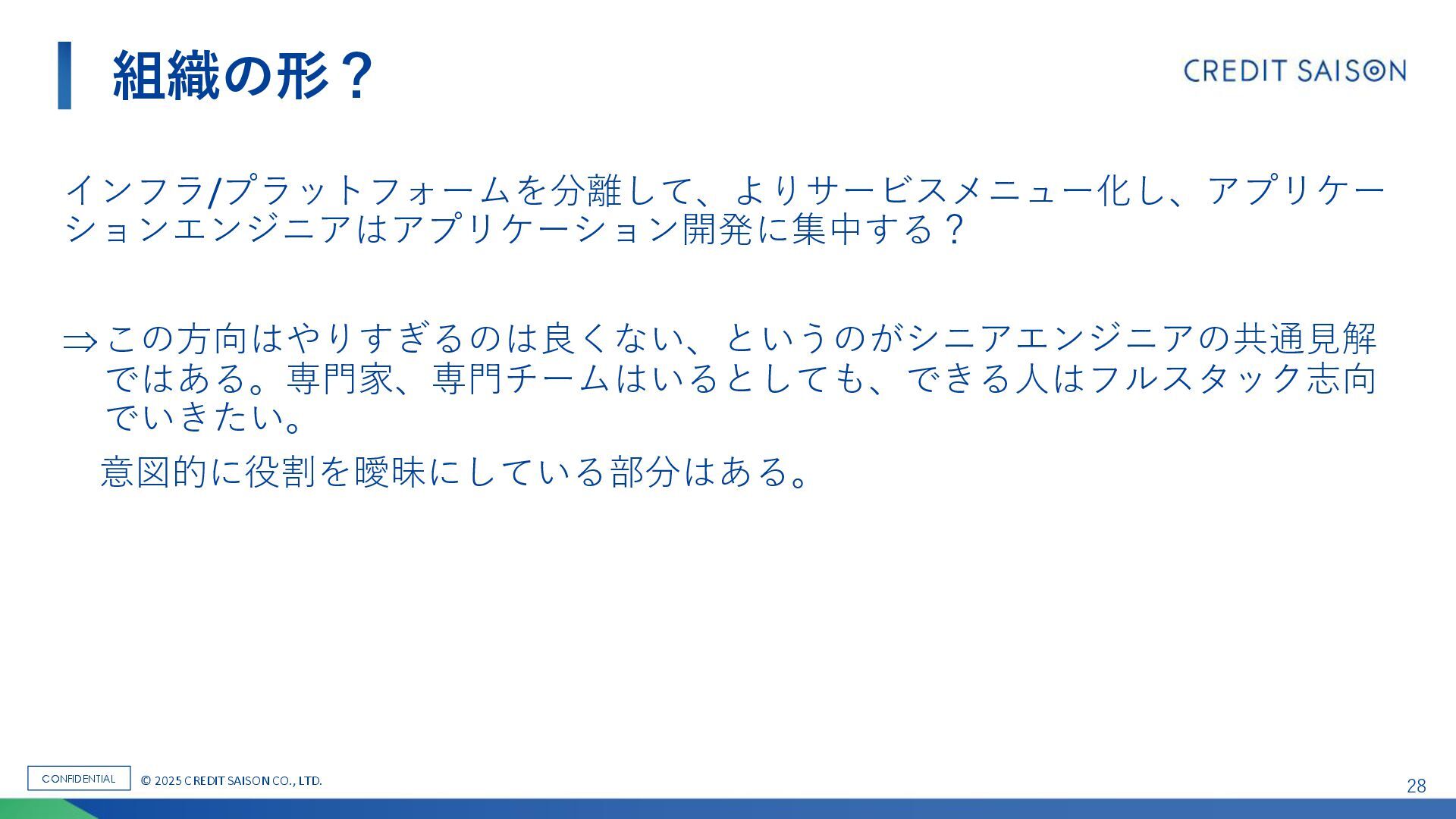 一方で、硬直した組織は技術的挑戦を難しくしたり、「インフラのことは知らない」のような官僚主義的な文化が生まれる恐れもあります。