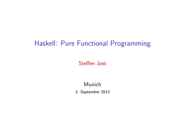 [3,2,1] reverse [] = [] reverse (h:t) = reverse t ++ [h] concat :: [[Int]] -> [Int] -- concat [[1,2],[3,4]] == [1,2,3,4] Lists are written using [ , , , ] “Cons”-operator is infix (:) :: a -> [a] -> [a] Syntactic sugar for lists: [1,2,3,4] -- shorthand for 1:2:3:4:[] [’c’..’g’] -- evaluates to "cdefg" [1,3..10] -- evaluates to [1,3,5,7,9] List comprehension similar notated to math. set-compreh. [ (x,z) | x <- [1,3..5], y <- [0..x], even y, let z = y+1 ] evaluates to [(1,1),(3,1),(3,3),(5,1),(5,3),(5,5)]
