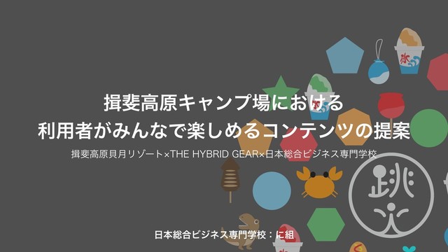輝け!キャリコン2019☆岐大 最優秀賞 日本総合ビジネス専門学校 に組(府川将太、魚住旭洋、鹿野詠稀、出口瑞渉、中村魁斗、林栄摩) 揖斐高原貝月リゾート×THE HYBRID GEAR×日本総合ビジネス専門学校が協力した揖斐高原キャンプ場における利用者がみんなで楽しめるコンテンツの提案。 夏の夜に自分の動き(ジャンプ)で、夏を連想させる模様(かき氷、スイカ・・etc)の花火を打ちあげることができるフィールドアクティビティです。