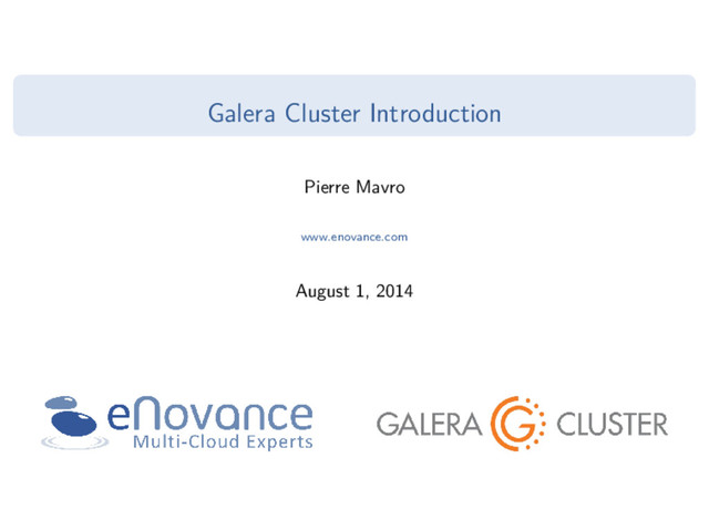 works fine over the WAN network. There will be a delay, which is proportional to the network round trip time (RTT), but it only affects the commit operation. Disaster Recovery: Disaster recovery is a sub-class of WAN replication. Here one data center is passive and only receives replication events, but does not process any client transactions. Such a remote data center will be up to date at all times and no data loss can happen. During recovery, the spare site is just nominated as primary and application can continue as normal with a minimal fail over delay. Latency Eraser: With WAN replication topology, cluster nodes can be located close to clients. Therefore all read & write operations will be super fast with the local node connection. The RTT related delay will be experienced only at commit time, and even then it can be generally accepted by end user, usually the kill-joy for end user experiences is the slow browsing response time, and read operations are as fast as they possibly can be. Pierre Mavro www.enovance.com Galera Cluster Introduction 10 / 34