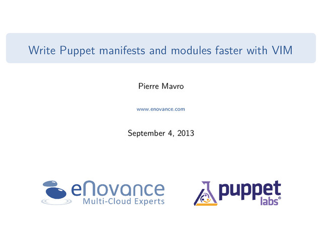 Puppet announced in 2011 an IDE plugin for Eclipse called Geppetto. I used it for more than a year and it really helps me to write manifests. Unfortunately, the latests versions purposed by Cloudsmith (Geppetto editor) get stability problems, even with the "all in one" version. In addition, Eclipse consume a lot of resources just for writing Puppet manifests. Another solution exist, this is set of VIM plugins which provide a lightweight solution. It gives more advanced features and automatically checks Puppet syntax (Geppetto too). This is what we’re going to see here with the usage. http://puppetlabs.com/blog/geppetto-a-puppet-ide/ http://cloudsmith.github.io/geppetto/ Pierre Mavro www.enovance.com Write Puppet manifests and modules faster with VIM 7 / 23