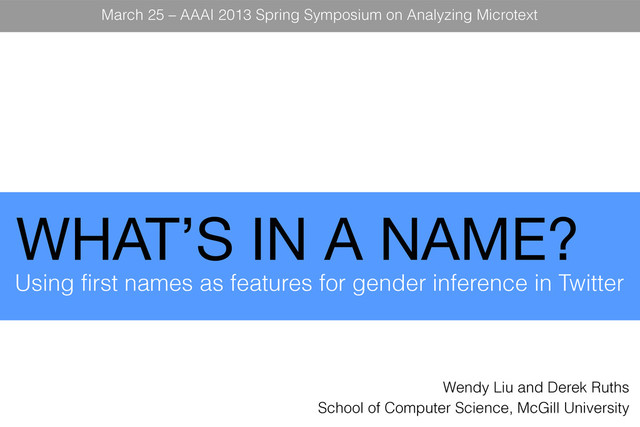 gender inference in Twitter Wendy Liu and Derek Ruths School of Computer Science, McGill University March 25 – AAAI 2013 Spring Symposium on Analyzing Microtext