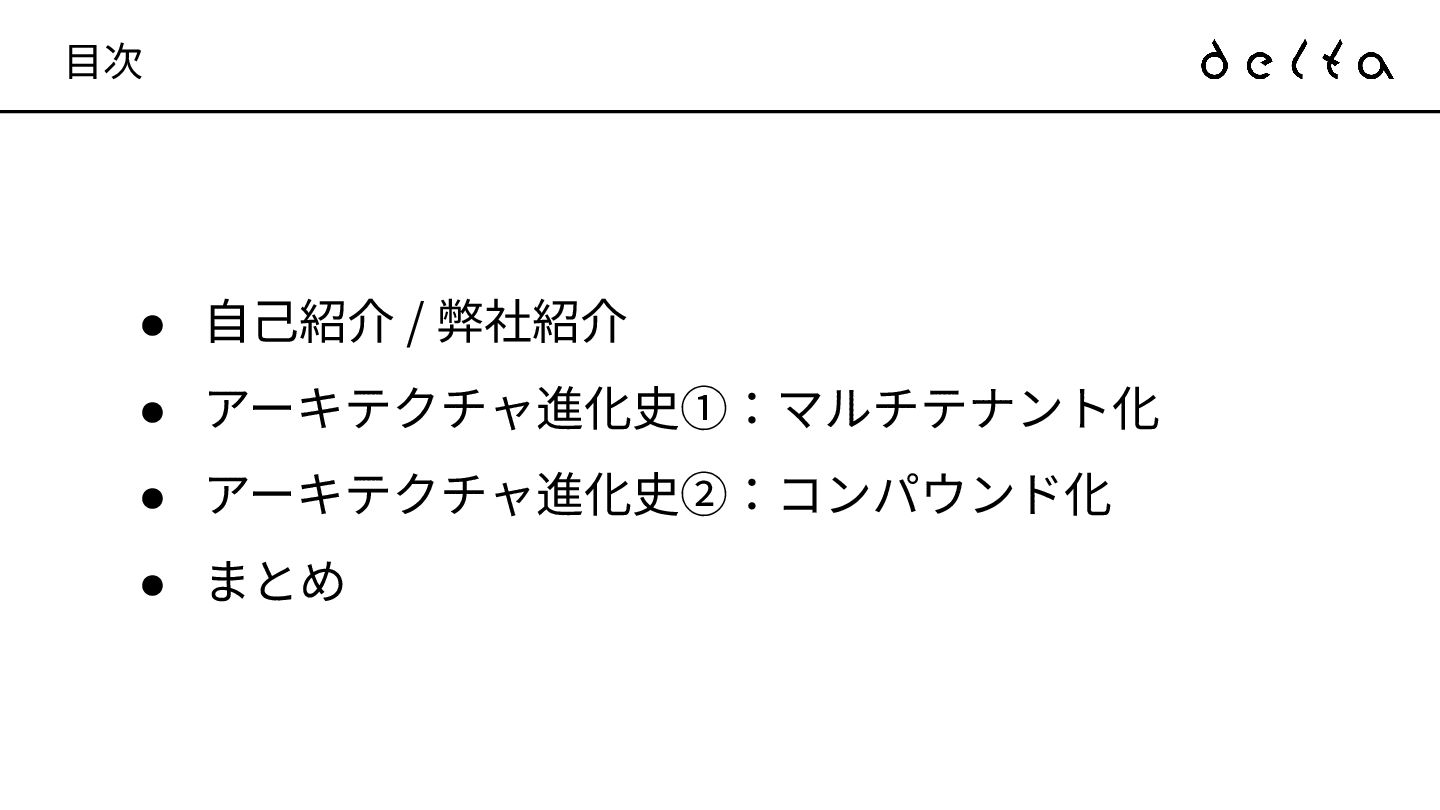 • ⾃⼰紹介 / 弊社紹介 • アーキテクチャ進化史①:マルチテナント化 • アーキテクチャ進化史②:コンパウンド化 • まとめ
