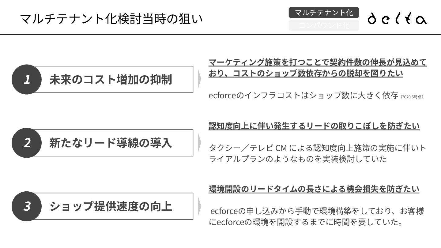環境開設のリードタイムの⻑さによる機会損失を防ぎたい ecforceの申し込みから⼿動で環境構築をしており、お客様 にecforceの環境を開設するまでに時間を要していた。 未来のコスト増加の抑制 新たなリード導線の導⼊ ショップ提供速度の向上 マルチテナント化検討当時の狙い 1 2 3