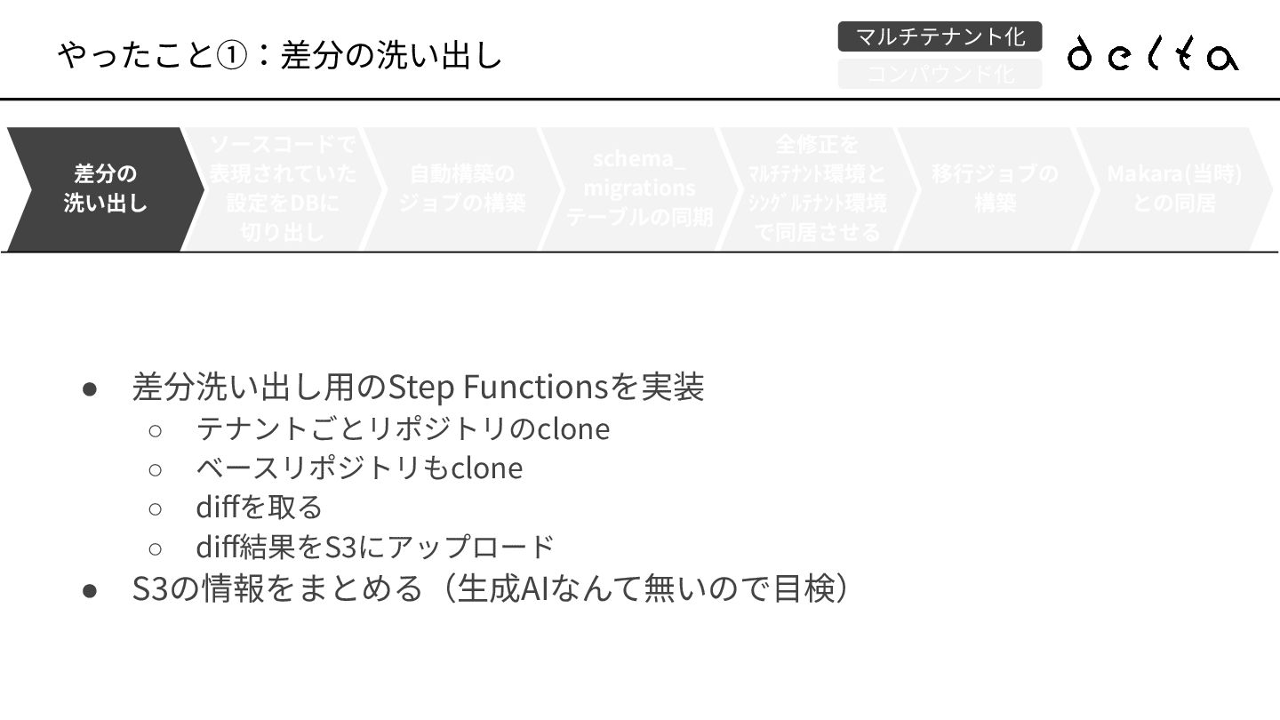 マルチテナント環境と シングルテナント環境 で同居させる 移⾏ジョブの 構築 Makara(当時) との同居 やったこと①:差分の洗い出し 差分の 洗い出し • 差分洗い出し⽤のStep Functionsを実装 ◦ テナントごとリポジトリのclone ◦ ベースリポジトリもclone ◦ diffを取る ◦ diff結果をS3にアップロード • S3の情報をまとめる(⽣成AIなんて無いので⽬検) マルチテナント化 コンパウンド化