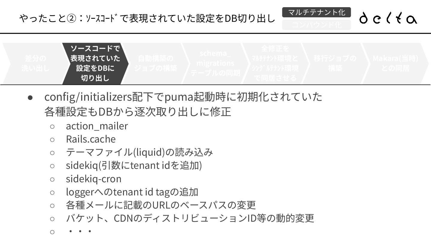 ソースコードで 表現されていた 設定をDBに 切り出し ⾃動構築の ジョブの構築 schema_ migrations テーブルの同期 全修正を
