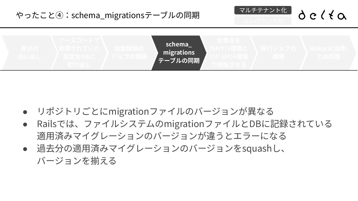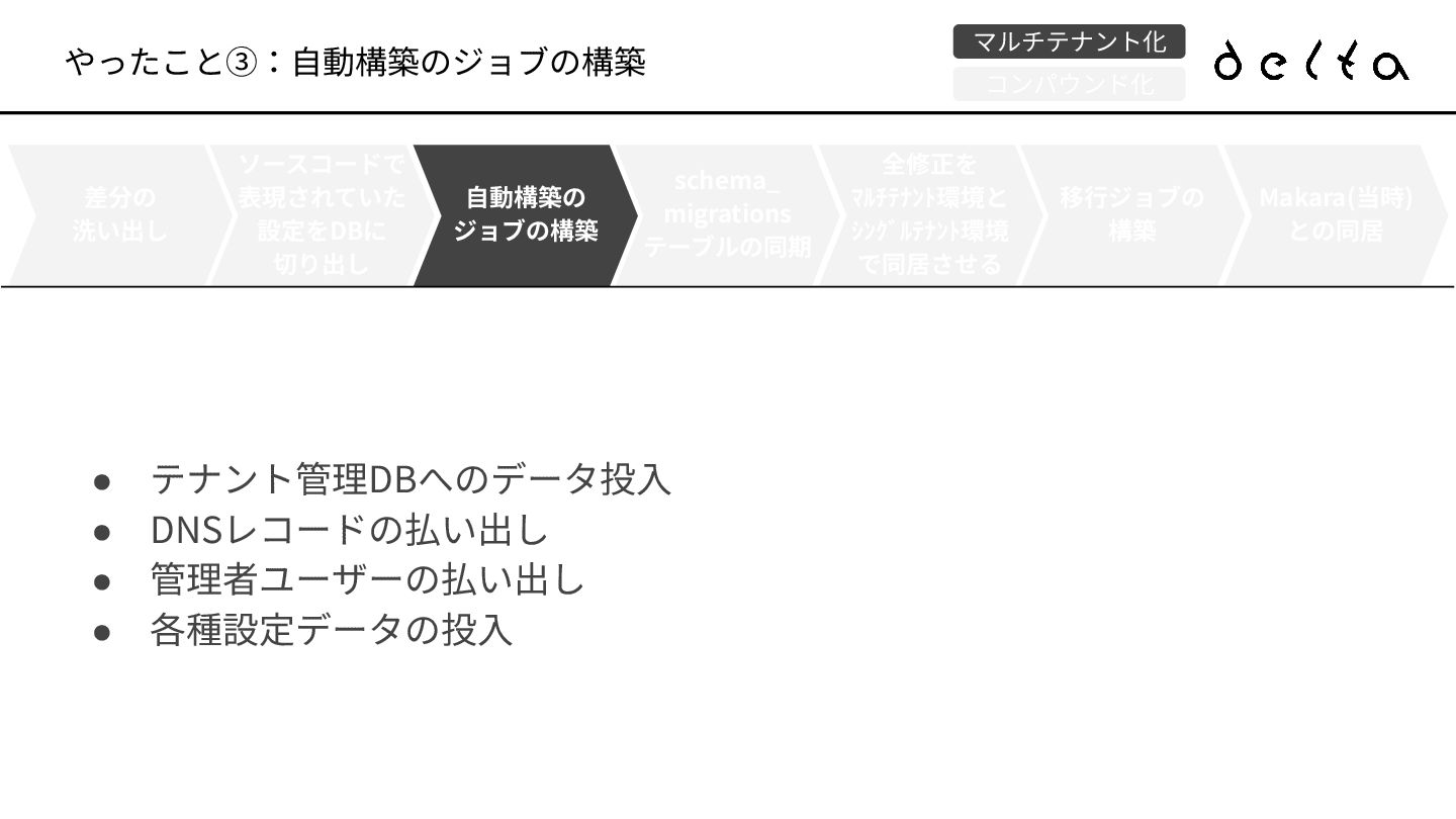 ソースコードで 表現されていた 設定をDBに 切り出し ⾃動構築の ジョブの構築 やったこと④:schema_migrationsテーブルの同期 schema_ migrations テーブルの同期 • リポジトリごとにmigrationファイルのバージョンが異なる • Railsでは、ファイルシステムのmigrationファイルとDBに記録されている 適⽤済みマイグレーションのバージョンが違うとエラーになる • 過去分の適⽤済みマイグレーションのバージョンをsquashし、 バージョンを揃える マルチテナント化 コンパウンド化