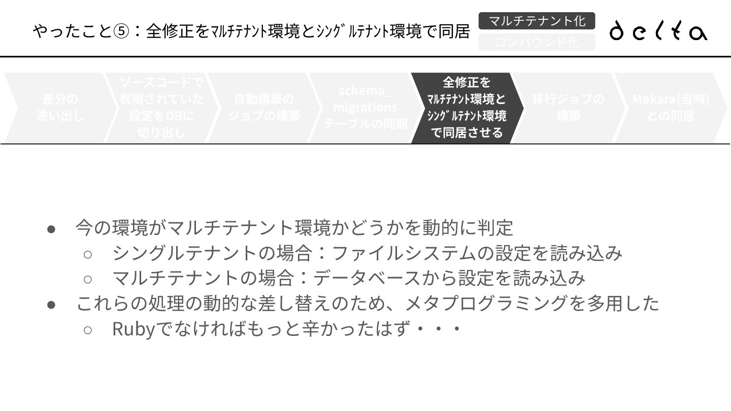 ⾃動構築の ジョブの構築 schema_ migrations テーブルの同期 やったこと⑤:全修正をマルチテナント環境とシングルテナント環境で同居 全修正を マルチテナント環境と シングルテナント環境 で同居させる • 今の環境がマルチテナント環境かどうかを動的に判定 ◦ シングルテナントの場合:ファイルシステムの設定を読み込み ◦ マルチテナントの場合:データベースから設定を読み込み • これらの処理の動的な差し替えのため、メタプログラミングを多⽤した ◦ Rubyでなければもっと⾟かったはず‧‧‧ マルチテナント化 コンパウンド化