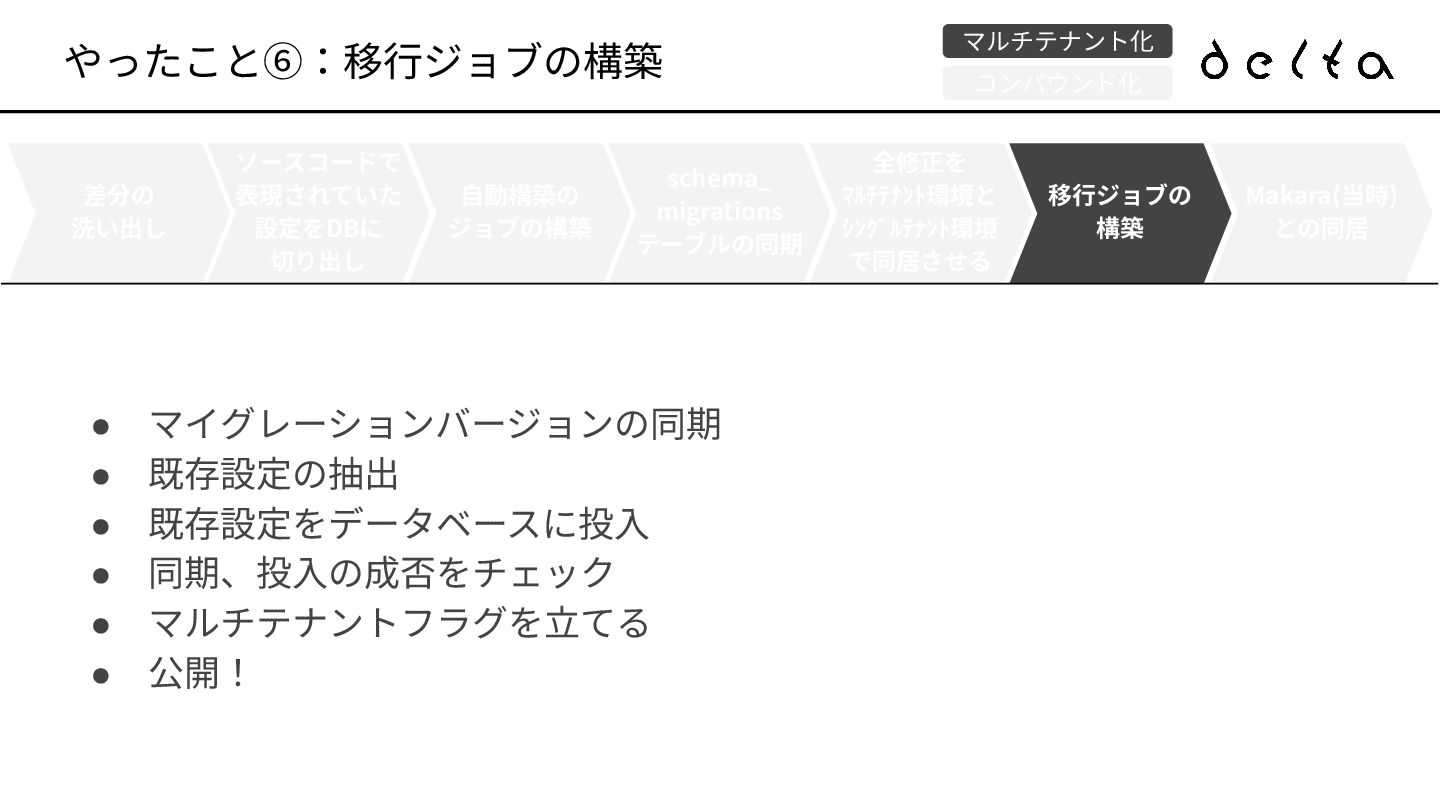 schema_ migrations テーブルの同期 全修正を マルチテナント環境と シングルテナント環境 で同居させる やったこと⑥:移⾏ジョブの構築 移⾏ジョブの 構築 • マイグレーションバージョンの同期 • 既存設定の抽出 • 既存設定をデータベースに投⼊ • 同期、投⼊の成否をチェック • マルチテナントフラグを⽴てる • 公開! マルチテナント化 コンパウンド化