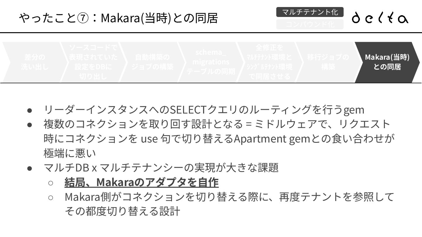 テーブルの同期 全修正を マルチテナント環境と シングルテナント環境 で同居させる 移⾏ジョブの 構築 やったこと⑦:Makara(当時)との同居 Makara(当時) との同居 • リーダーインスタンスへのSELECTクエリのルーティングを⾏うgem • 複数のコネクションを取り回す設計となる = ミドルウェアで、リクエスト 時にコネクションを use 句で切り替えるApartment gemとの⾷い合わせが 極端に悪い • マルチDB x マルチテナンシーの実現が⼤きな課題 ◦ 結局、Makaraのアダプタを⾃作 ◦ Makara側がコネクションを切り替える際に、再度テナントを参照して その都度切り替える設計 マルチテナント化 コンパウンド化