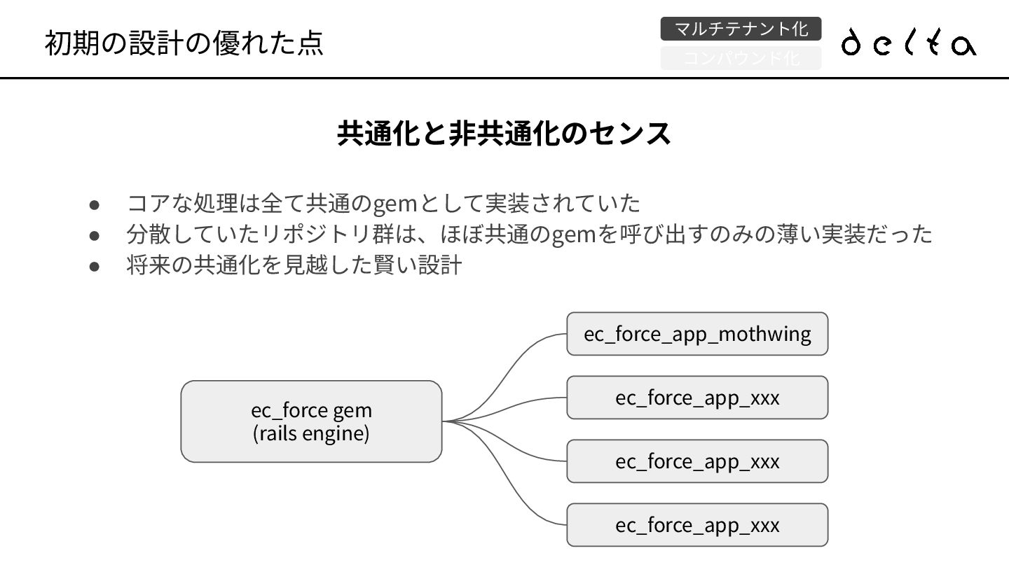 • コアな処理は全て共通のgemとして実装されていた • 分散していたリポジトリ群は、ほぼ共通のgemを呼び出すのみの薄い実装だった • 将来の共通化を⾒越した賢い設計 マルチテナント化 コンパウンド化