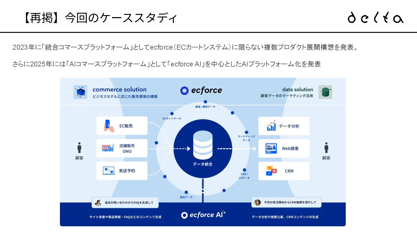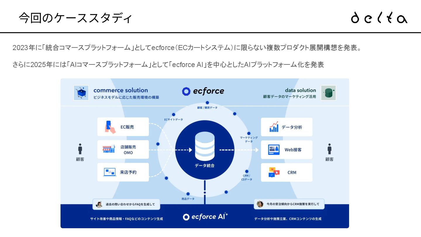 今回のケーススタディ 2023年に「統合コマースプラットフォーム」としてecforce(ECカートシステム)に限らない複数プロダクト展開構想を発表。 さらに2025年には「AIコマースプラットフォーム」として「ecforce AI」を中心としたAIプラットフォーム化を発表