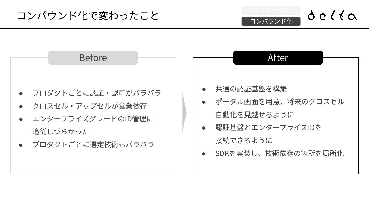 コンパウンド化で変わったこと • プロダクトごとに認証‧認可がバラバラ • クロスセル‧アップセルが営業依存 • エンタープライズグレードのID管理に 追従しづらかった • プロダクトごとに選定技術もバラバラ