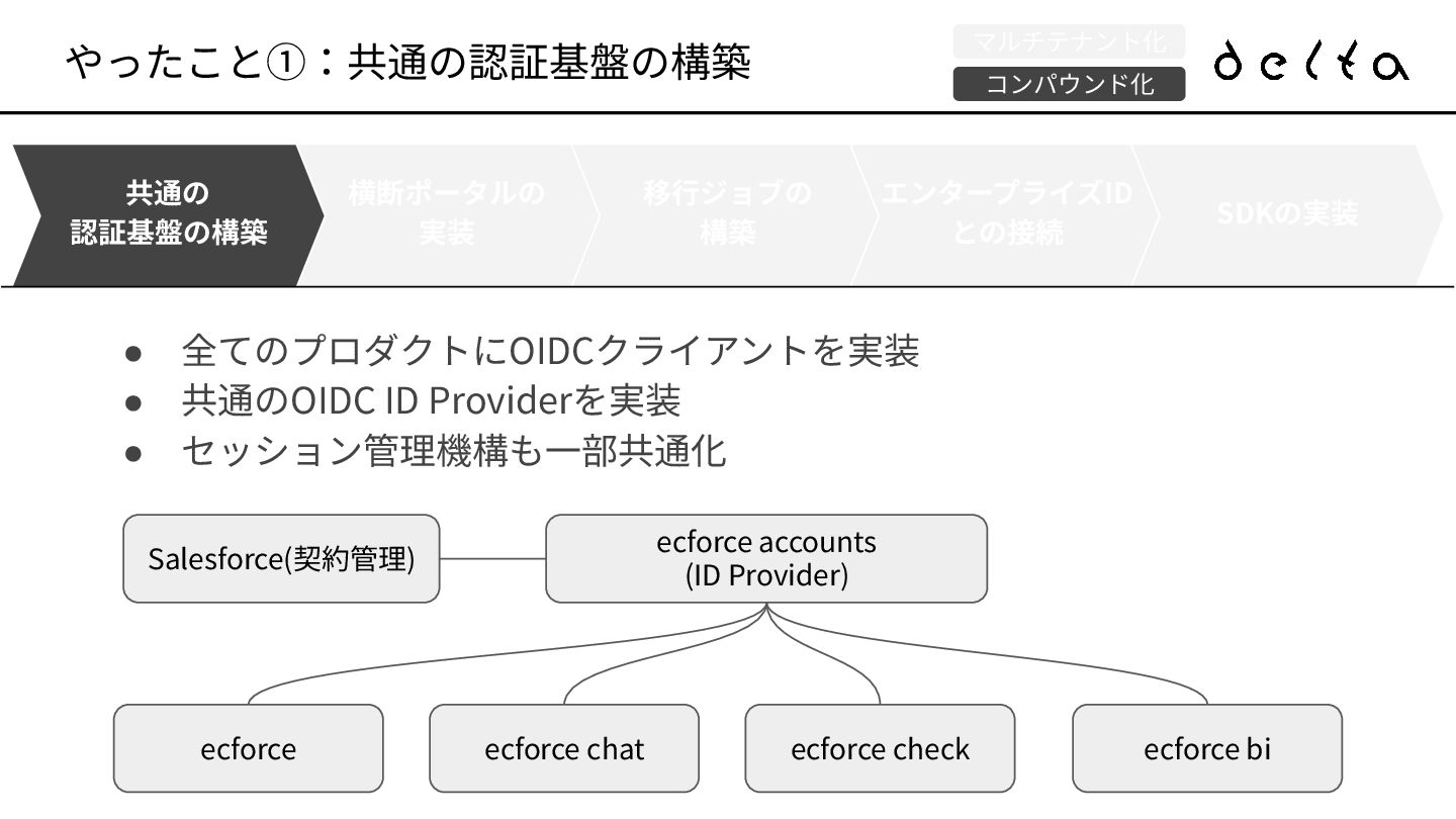 accounts (ID Provider) ecforce ecforce chat ecforce check ecforce bi Salesforce(契約管理) 横断ポータルの 実装 移⾏ジョブの 構築 エンタープライズID との接続 SDKの実装 共通の 認証基盤の構築 マルチテナント化 コンパウンド化