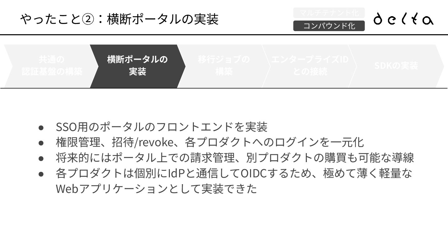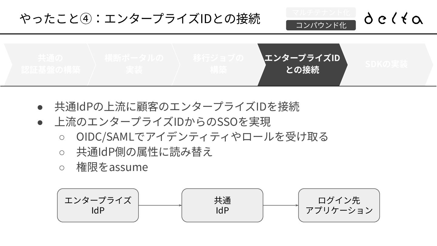 アプリケーション 横断ポータルの 実装 移⾏ジョブの 構築 SDKの実装 • 共通IdPの上流に顧客のエンタープライズIDを接続 • 上流のエンタープライズIDからのSSOを実現 ◦ OIDC/SAMLでアイデンティティやロールを受け取る ◦ 共通IdP側の属性に読み替え ◦ 権限をassume マルチテナント化 コンパウンド化