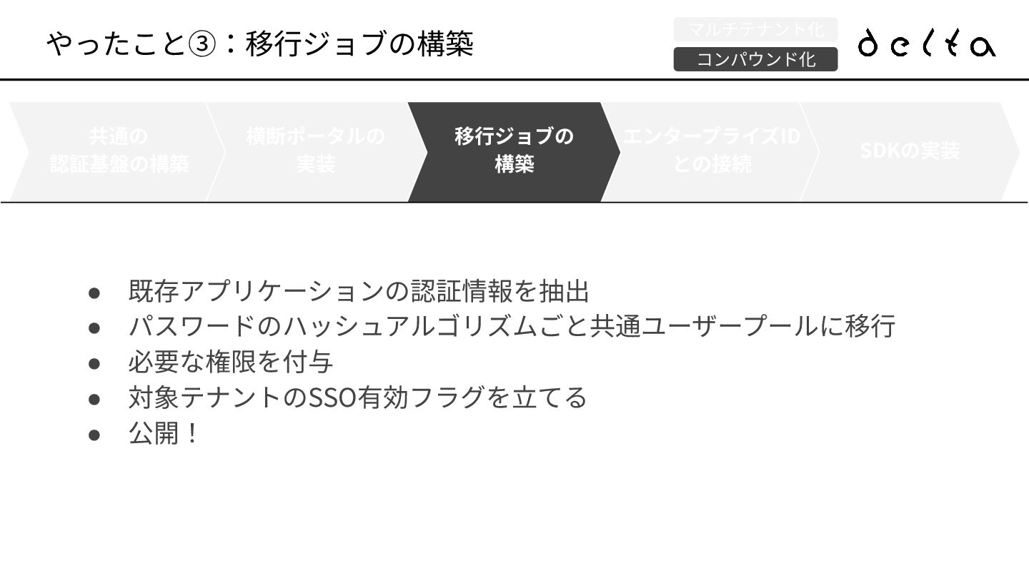 • 既存アプリケーションの認証情報を抽出 • パスワードのハッシュアルゴリズムごと共通ユーザープールに移⾏ • 必要な権限を付与 • 対象テナントのSSO有効フラグを⽴てる • 公開! マルチテナント化 コンパウンド化